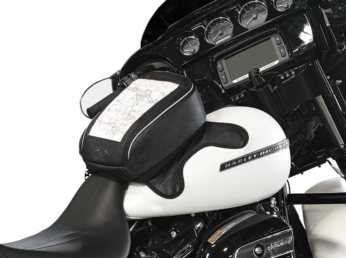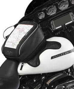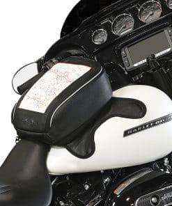 Bolso de depósito cónico para la mayoría de los tanques de Cruiser con paneles de aspecto similar al cuero, cierres de cremallera de bobina inversa para mantener fuera el polvo y la suciedad, tiradores de cremallera de goma de alta densidad bloqueables que se manejan fácilmente con guantes. Bolsillo superior compatible con dispositivos de pantalla táctil para mapas en papel, GPS o teléfono inteligente. El bolso mantiene su forma, tiene tuberías reflectantes e interior forrado, funda para lluvia integrada guardada en bolsa de almacenamiento, sección expandible en cuna cuando se necesita más espacio. Material base protector que evita resbalones o marcas, dimensiones: 10″L x 8″A x 4″A/10″L x 8″A x 6″A expandido, capacidad de 5 litros/7 litros expandido.