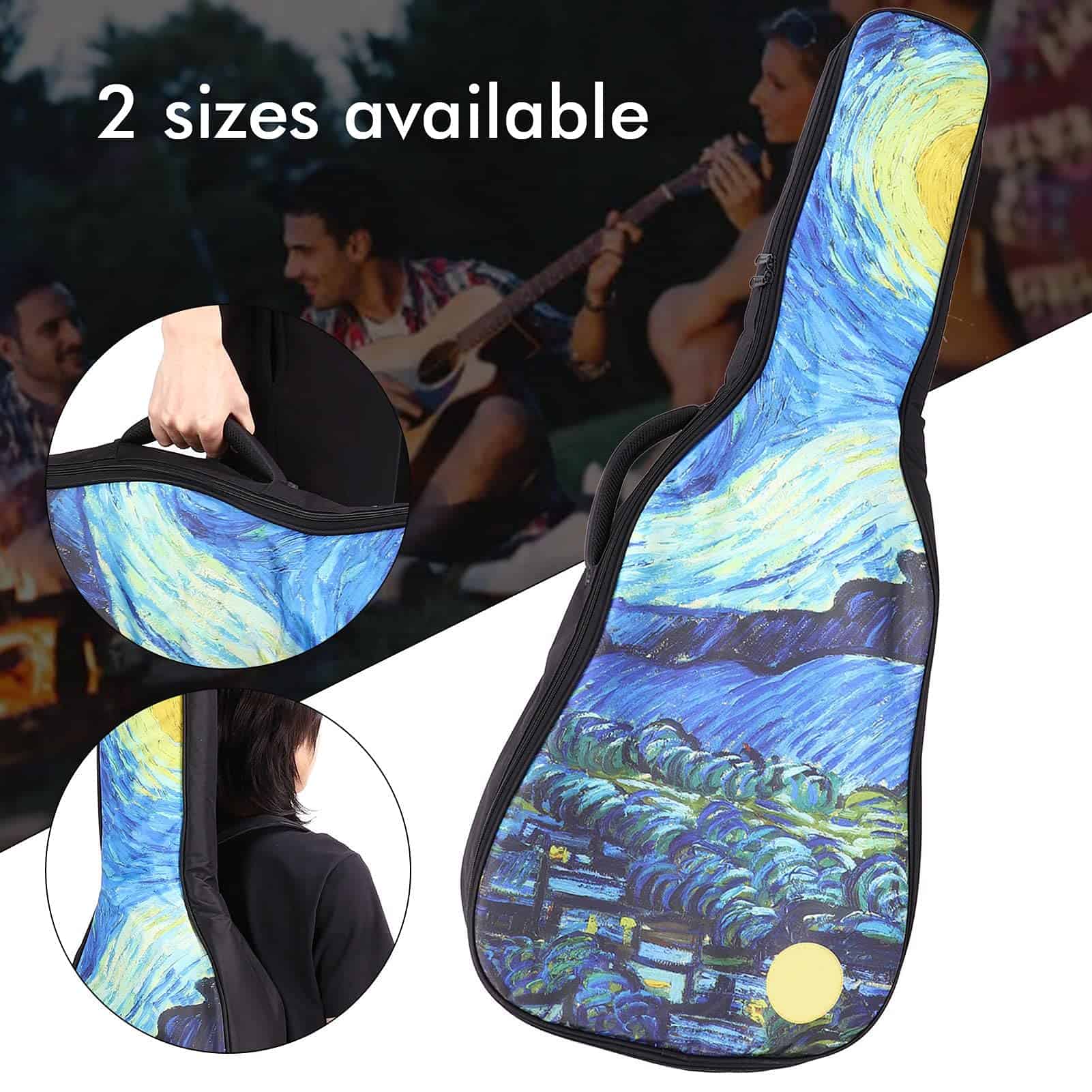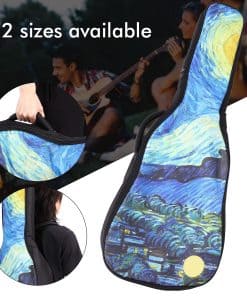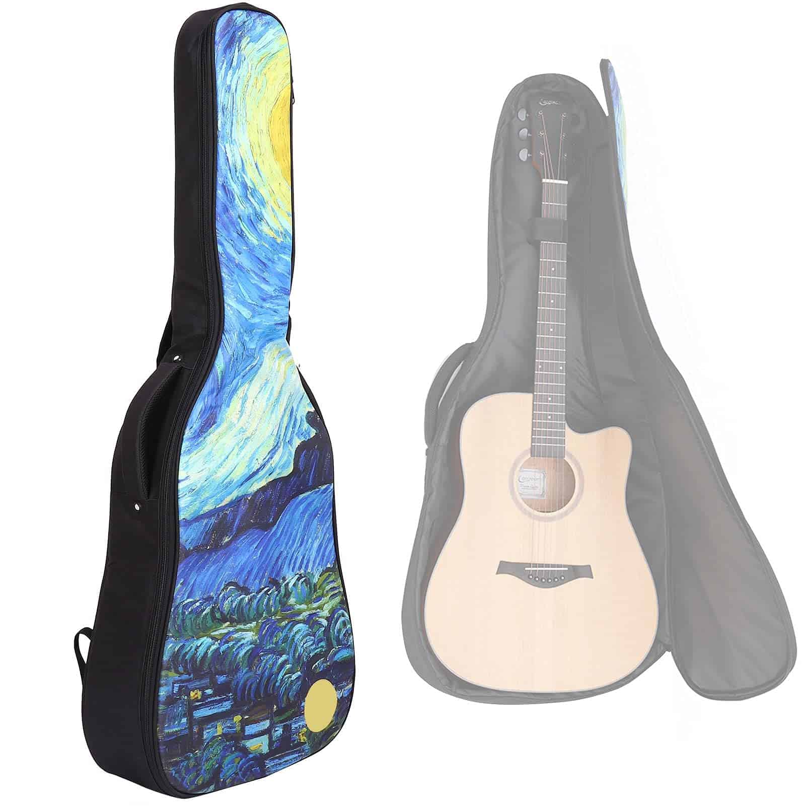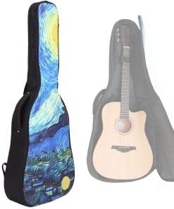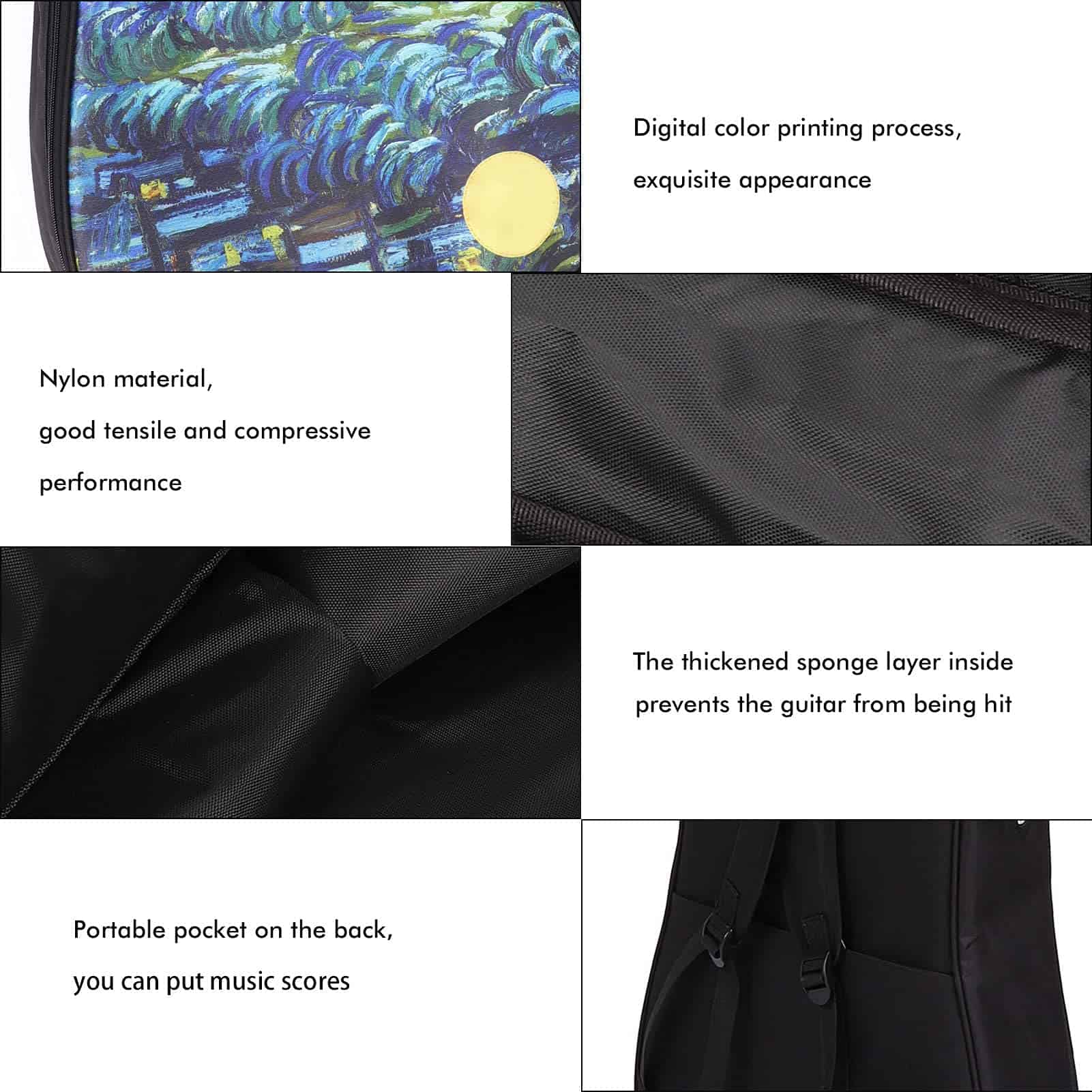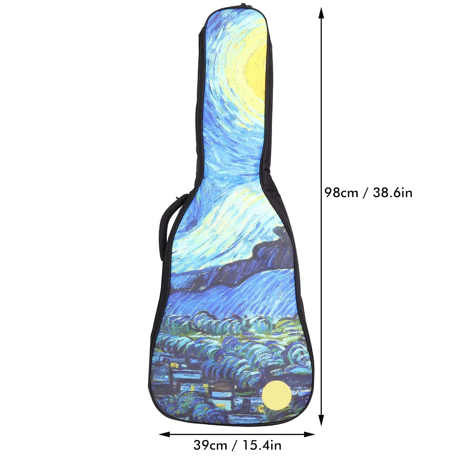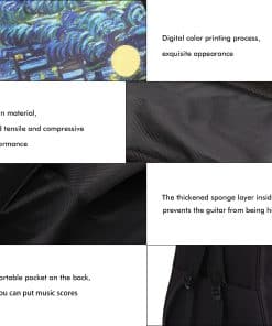 Característica: 1. La parte frontal del bolso de guitarra está decorada con un patrón de cielo estrellado, y la parte posterior es una correa, que es exquisita e individual. 2. Hay dos correas para los hombros en la parte posterior del bolso de guitarra que se pueden usar como mochila, y hay un bolso de mano en el lateral para facilitar el transporte. 3. El exterior está hecho de material de nylon, que tiene buena resistencia y alta resistencia a la tracción, y no es fácil de usar después de un uso prolongado. 4. Hay una capa de esponja gruesa dentro del bolso de almacenamiento, que se puede presionar a voluntad, lo que puede proteger mejor la guitarra del impacto. 5. Hay un bolsillo en la parte trasera del bolso de guitarra, que se puede utilizar para guardar cosas como partituras, y es un bolso de almacenamiento muy versátil. Especificación: Tipo de Artículo: Mochila de Guitarra Material Principal: Nylon + Esponja Especificación de 36 pulgadas: Aprox. 39 x 98 cm / 15.4 x 38.6 pulgadas Especificación de 40/41 pulgadas: Aprox. 41 x 110 cm / 16.1 x 43.3 pulgadas Instrumentos Musicales Aptos: Guitarra acústica folklórica Lista de Paquetes: 1 x Mochila de Guitarra