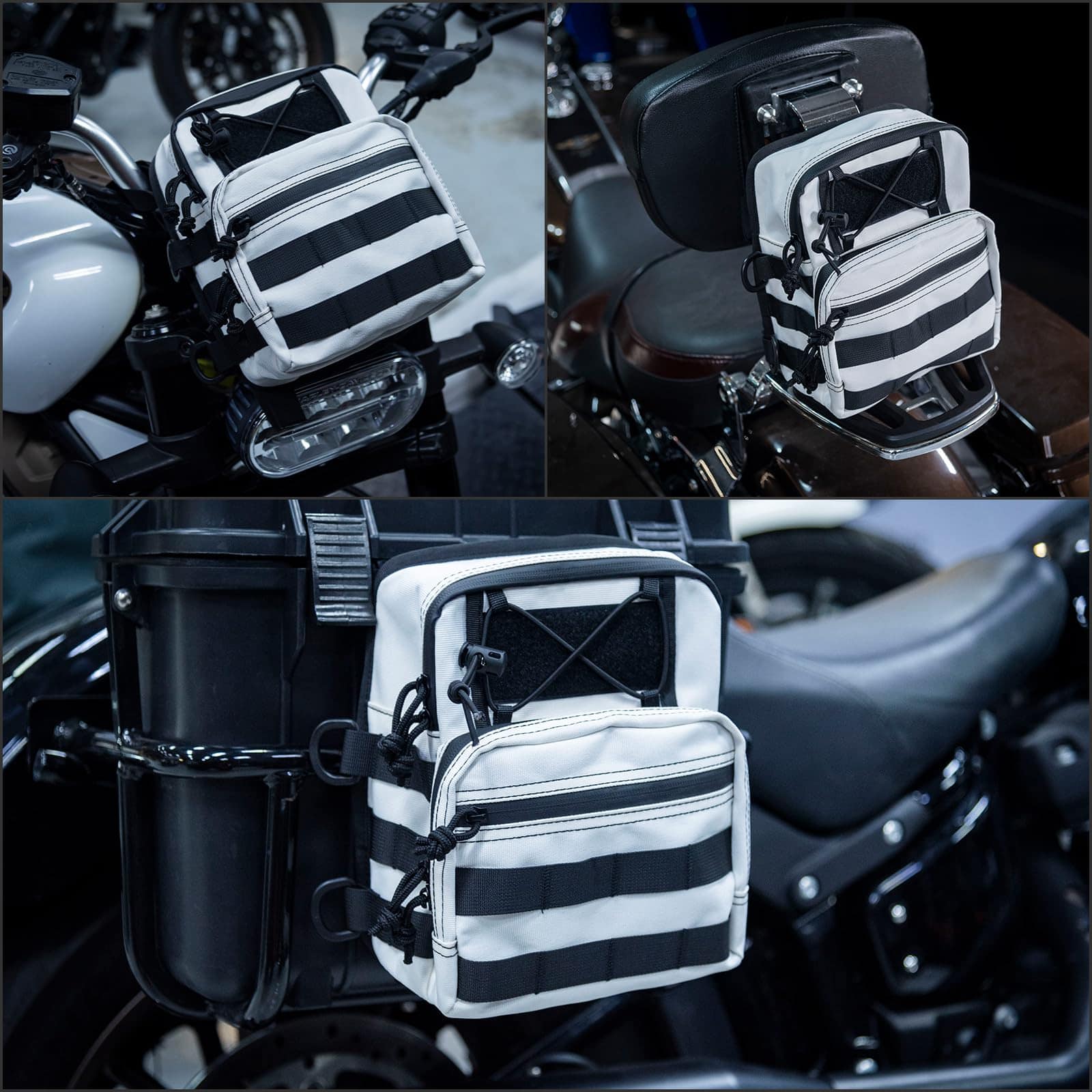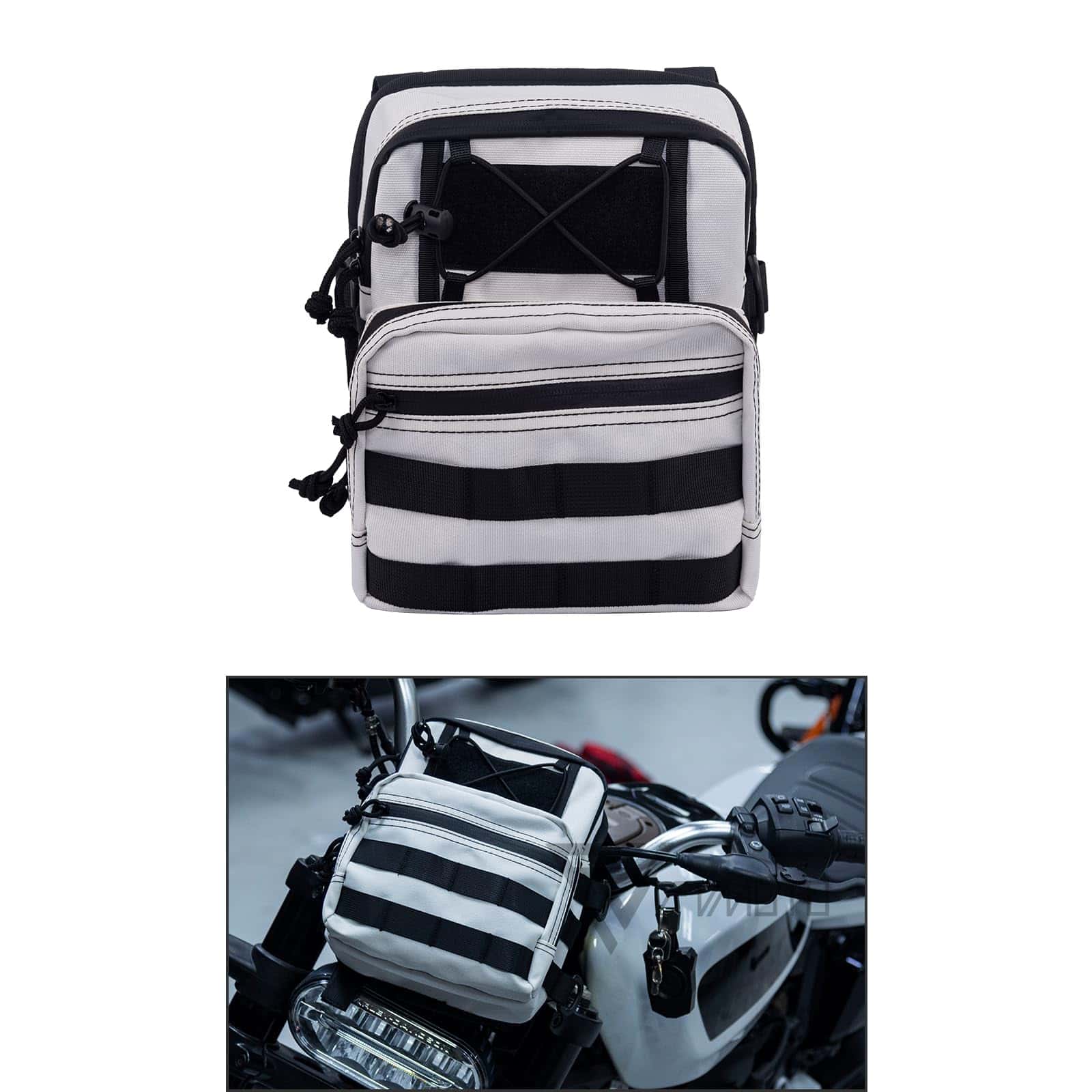 Bolso de Almacenamiento Multifuncional – El bolso de manillar se puede configurar de muchas maneras, como detrás del carenado, arriba del faro o llevarlo contigo usando la correa para el hombro.