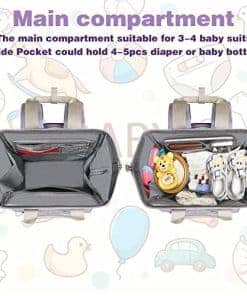 3. Tela impermeable y organizador de pañales. Bolsillos impermeables para pañales de niños pequeños, podrías poner los pañales húmedos de tu bebé, pañales o incluso pantalones sucios del bebé en el bolsillo. No se ensuciará con cosas del compartimento principal. El compartimento organizador de pañales podría contener 4-5 pañales. Es rápido agarrar un pañal del bolsillo. Y en el compartimento principal podrías poner 3-4 trajes para bebé o algo más. Muchos compartimentos separadores para pañales y ropa suficiente para un niño pequeño y cosas de bebé.