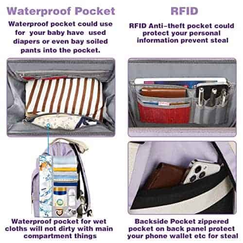 4. Correas para cochecito y función. La correa del cochecito y la correa del equipaje permiten colocar la bolsa de pañales del bebé en el coche de bebé y en el equipaje de mano con ruedas. Es conveniente y práctico. 1 bolsillo RFID podría proteger tu información personal para evitar robos, el puerto de carga USB podría cargar el teléfono en cualquier momento (BANCO DE ENERGÍA NO INCLUIDO). El cojín para el hombro protege completamente tu hombro y te hace sentir cómodo, no te calentará mucho la espalda. El bolsillo trasero de la mochila de pañales es seguro para tu teléfono, etc.
