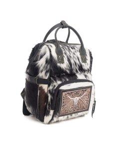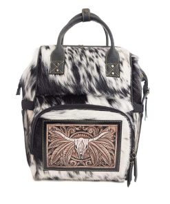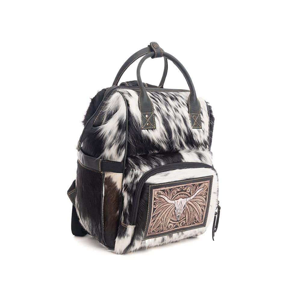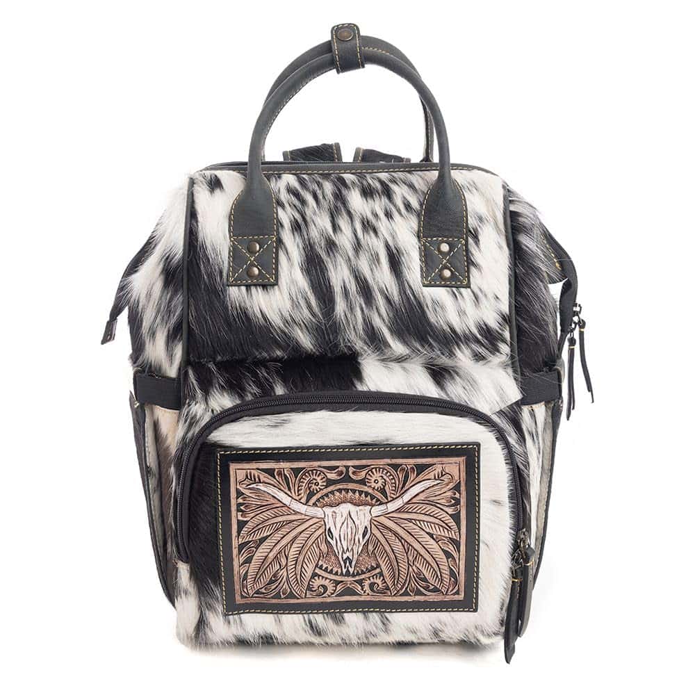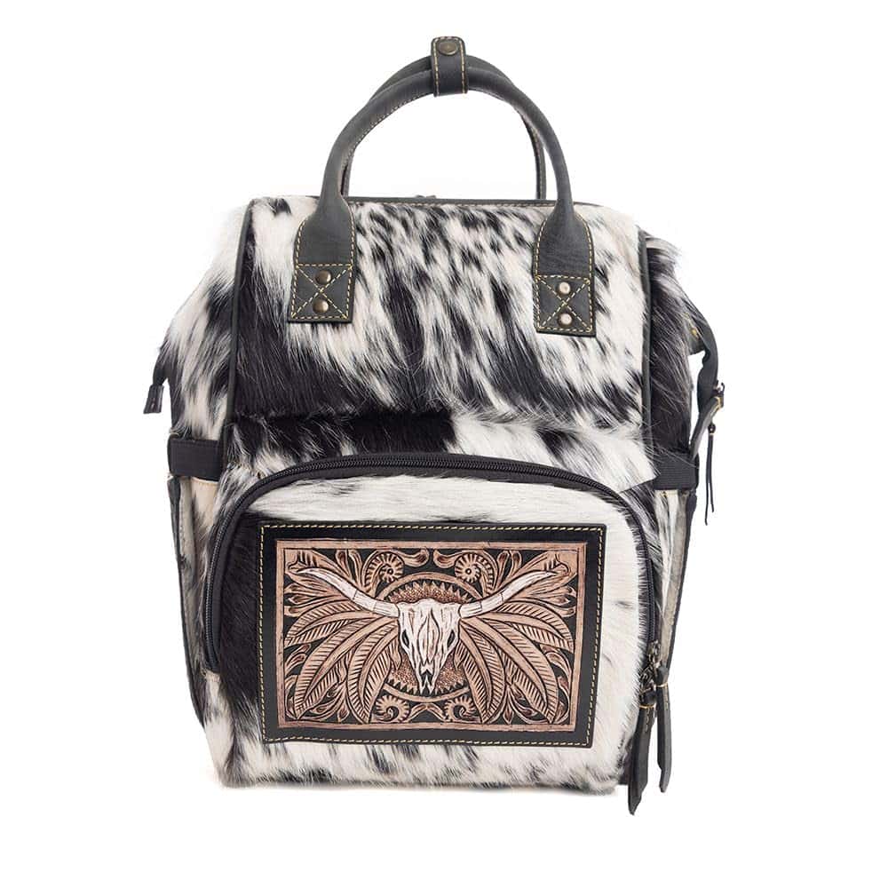Esta increíblemente hermosa bolsa combina un diseño magnífico con una utilidad útil. Negro y piel clara se fusionan perfectamente con cuero ébano. El panel frontal está adornado con una maravillosa escena tallada a mano de un cráneo de toro de la pradera. Los bolsillos prácticos organizarán tus pertenencias con facilidad. Cierre de cremallera en la parte superior. La parte trasera es una lona especial de tejido de gofre, completa con un bolsillo adicional con cremallera. Los mangos para llevar son de cuero, y las correas de hombro ajustables son de cuero bicolor y piel. ¡Un bolso impresionante que te encantará llevar!