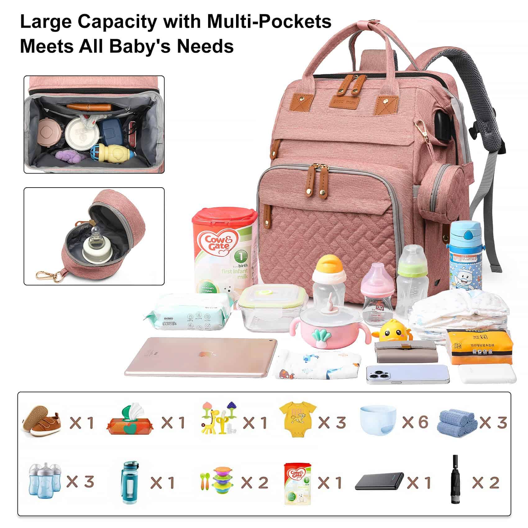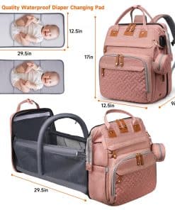 Nuestra mochila de pañales es una versión mejorada resistente al agua y duradera. Con un diseño único y de alta calidad, permite un almacenamiento más grande y flexible para tus esenciales. Esta mochila de pañales tiene un diseño multifuncional 3 en 1, es muy práctica y puede ayudarte a organizar eficientemente las necesidades de 1-2 bebés en el menor tiempo. Suficientemente espaciosa, fácil de acceder. Durante tus ajetreados días de la semana y los fines de semana agradables, esta bolsa para bebé te acompañará para realizar asombrosas funciones de almacenamiento. Es la bolsa de viaje ideal para viajes más largos con 2 hebillas integradas para cochecito. La dimensión de la mochila de pañales es de 16» x 8.5» x 12.5» pulgadas con 19 diferentes tipos de bolsillos, suficiente para almacenar todos los artículos diarios de los niños. 2 bolsillos aislados para biberones pueden contener la mayoría de biberones, por lo que no tienes que preocuparte por que la leche en polvo se enfríe. La mochila también cuenta con puerto de carga USB, más conveniente para cargar tu teléfono cuando estás fuera y viajando. Nuestro bolso de pañales es muy práctico. Su diseño unisex lo hace adecuado tanto para mamás como papás. Una excelente elección de regalo para baby shower, búsqueda de registro de bebés, Día de la Madre, Día de Acción de Gracias, Navidad y regalo para mujeres que los nuevos padres realmente usarán. Cada bolsa de pañales pasará por una estricta inspección para asegurarse de que cada cliente la reciba con alegría y satisfacción. Como la mochila de pañales se envía plegada, tendrás que abrirla y luego simplemente ordenarla para que recupere su forma original. Nota importante: esta mochila de pañales debe ser acompañada por adultos, y los niños no pueden dormir solos dentro de ella.