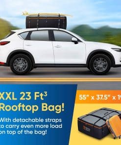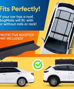 WE AT BAGMATE LIKE THEM BIG. XL/XXL BIG. As far as vehicle cargo carriers go, our BagMate aerodynamic rooftop cargo carrier is a pure convenience. Make your travel checklist as long as you need it to be: our spacious 23 cubic feet roof bag can hold up to 8 suitcases. And, just when you think you hit the limit, the handy detachable straps come off to create even more room on top of your cargo bag for some more of your stuff. Pretty neat, don’t you think. ENSURE YOUR TRAVEL GOES SMOOTHLY. Your safety is our number one priority, so we took special care designing our car top carrier to guarantee you smooth sailing. Extremely durable, the bag has heavy-duty straps and safe-to-use door hooks. Some vehicle cargo carriers are fastened with straps that go inside the car, but that could be quite dangerous because they can prevent airbags from opening properly. Our high-quality cargo carrier bag with reliable equipment will ensure you travel safely. THERE IS NO BAD WEATHER FOR BAGMATE CARGO CARRIER. We didn’t just make our cartop carrier waterproof, we gave it triple protection! Made from military-grade fabric with thick PVC coating, a waterproof SBS zipper and zipper covers with hook and loop fasteners, this cargo carrier can withstand virtually any weather conditions. Rain, snow, even the hot Texas sun will not damage your trusty BagMate car roof bag. 100% waterproof, UV-protected, always ready to go! EXTREMELY DURABLE ROOF CARGO BAG FOR ANY VEHICLE WITH A ROOF. BagMate car top carrier roof bag is suitable for all kinds of cars. You can use BagMate as a roof rack bag, tie it to your rails, or use our safe and easy-to-use door hooks to fasten it directly to the car. Every part of the bag is made from extremely durable materials. The SBS double zipper is nearly indestructible and, along with the UTX POM buckles, will ensure your luggage stays put for the duration of your travels. WE’LL MAKE THE DEAL EVEN SWEETER by giving you a 12-month warranty on your top-notch BagMate car cargo carrier. You won’t need it though because this roof cargo carrier is highly durable! Keep this foldable bag stored away until you need it, and then it will follow you anywhere in any conditions, keeping your roof cargo safe and secure. You won’t find a better and more trustworthy companion for your travels.