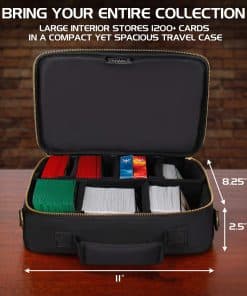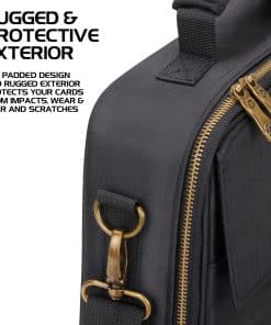 Serie ENHANCE TabletopProtege y guarda tu colección de cartas coleccionables con el estuche de cartas ENHANCE. El estuche fue diseñado específicamente para jugadores de cartas y gamers que a menudo necesitan llevar varios mazos personalizados o colecciones más grandes a torneos, eventos de juegos comunitarios, o para usarlo como estuche de almacenamiento protector en casa.Un diseño moderno con herrajes de color bronce y tiradores de cremallera con un exterior texturizado negro profundo ofrece una apariencia profesional para eventos de torneos. El interior es completamente ajustable con 7 separadores removibles para crear compartimentos de tamaño personalizado para estuches Ultra Pro, cartas con fundas sueltas, cajas de almacenamiento de cartulina BCW, y mucho más. Nuestro diseño único cuenta con 3 lazos integrados para bolígrafos y lápices y un bolsillo con cremallera para sostener pequeños blocs de notas, dados, fichas y otros objetos pequeños necesarios para jugar juegos como MTG (Magic the Gathering), Pokemon, Yugioh y otros juegos de cartas coleccionables.