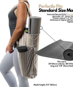 El bolso de yoga Yogiii es el accesorio esencial para cualquier amante del yoga. Con un diseño elegante de rayas color beige latte, este bolso se adapta a la mayoría de las esterillas de yoga. Cuenta con un amplio bolsillo lateral para guardar tus pertenencias durante la práctica y un bolsillo con cremallera para objetos de valor. ¡Haz que llevar tu esterilla de yoga sea fácil y con estilo con el bolso de yoga Yogiii!