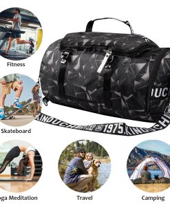 Dimensiones del bolso: 20 x 11 x 11 pulgadas (L x A x H). Ligero, solo 1.85LB. Capacidad de 50 libras. Cierre de cremallera. Material de alta calidad hecho de tela de oxford resistente al agua y a los arañazos, duradera, resistente, amigable con la piel y fácil de limpiar o limpiar. Adopta cremalleras profesionales SBS y almohadillas gruesas, acolchadas y transpirables, que le brindan un fuerte soporte para la espalda y liberan la carga del hombro. Separación seca-húmeda y almacenamiento de zapatos separados Bolsillos de almacenamiento húmedos y secos colocados independientemente con forro de PVC impermeable y cierre de cremallera suave, perfecto para almacenar ropa mojada y toalla húmeda, lo que le permite separar elementos secos de otros elementos y mantener la bolsa ordenada y seca. Bolso de viaje con compartimento separado para zapatos para mantener los zapatos limpios separados de otros elementos. Correa removible y ajustable 4 formas de llevar (Mochila / Bolso de hombro / Bolso bandolera / Bolso de mano). Tiene una correa larga ajustable adecuada para cada forma corporal. Las correas de la mochila se pueden ocultar cuando la usa como bolso de hombro. Puede convertir la bolsa libre y fácilmente para adaptarse a sus diferentes necesidades. Puede ser su mochila diaria, espaciosa bolsa para computadora portátil para viajes de negocios universitarios o uso diario en cualquier lugar. Aplicaciones versátiles Unisex Gran mochila versátil para laptop, bolso elegante para varios escenarios con un interior espacioso (más de 3,000+ pulgadas cúbicas); perfecto para viajar o guardarlo para diversas actividades y ocasiones, como yoga, baile, gimnasia, boxeo, viaje, entrenamiento, baloncesto, natación, tenis, playa. Una bolsa imprescindible para el aire libre.