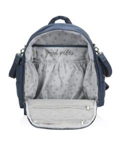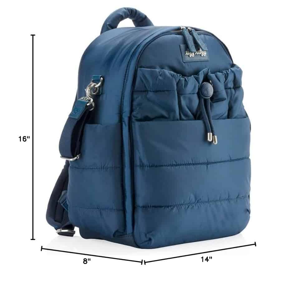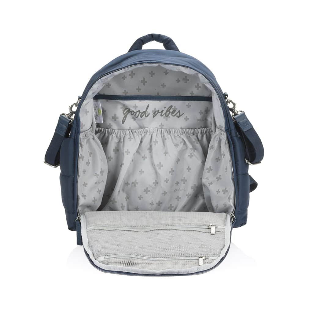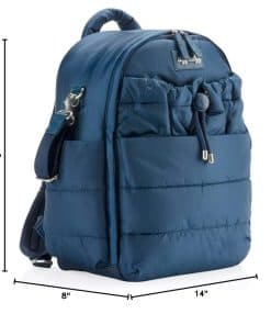 ¡Diseñado para aquellos con la cabeza en las nubes y los pies (normalmente corriendo) en el suelo, nuestra mochila de estilo acolchado hace una declaración total mientras equilibra forma y función! La mochila es espaciosa y amplia con un total de 14 bolsillos (7 exteriores y 7 interiores) e incluye 2 bolsillos aislados para biberones y un conveniente bolsillo para portátil, ¡perfecto si lo estás utilizando como bolso de trabajo! El interior de la bolsa también presenta un mensaje inspirador. La mochila mide 14.5″L x 8.5″W x 16″H e incluye correas para cochecito, un cambiador, correas para hombros ajustables, un compartimento frontal con un cordón de moda y un bolsillo para portátil. La base de goma con la marca Itzy Ritzy ayuda a mantener la bolsa estable y limpia, ¡todo mientras se ve adorable con un ribete trenzado!