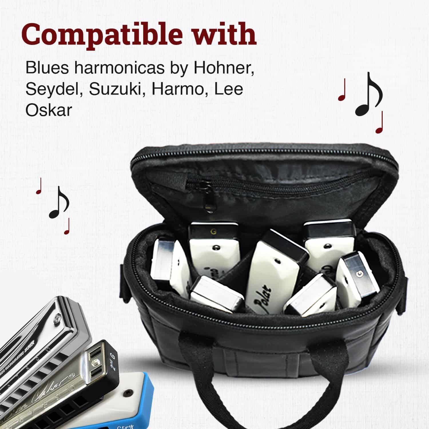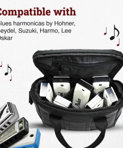 Su bolso para armónicas de uso diario. Diseñado en EE. UU. por un músico profesional de armónica. Nuestro bolso de vinilo Gig Bag 7 es el bolso que necesita cuando desea viajar ligero con sus armónicas. Muy espacioso, compacto y ligero al mismo tiempo, le ayudará a llevar sus armónicas a cualquier lugar. Se adapta a cualquier tipo de marca de armónica de blues diatónicas. Tiene una ranura inteligente para el cinturón en la parte posterior, así como un asa. Incluye bolsillo interior con cremallera + correa para el hombro. Puede llevarlo de 3 formas: unido a su cinturón, sostenerlo en su mano o alrededor de su cuello/hombro usando la correa para el hombro. Material de alta calidad y resistente.