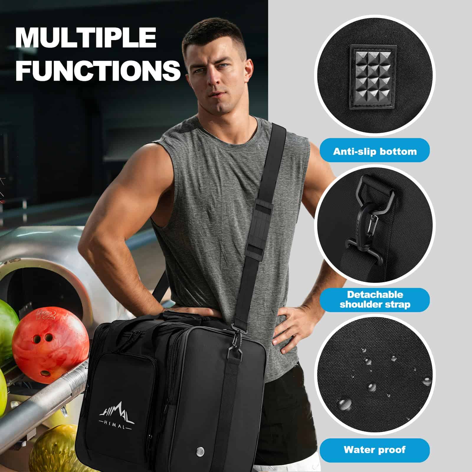 El bolso para bola de bolos Himal es la opción perfecta para transportar tu equipo de bolos de manera segura y conveniente. Con espacio suficiente para todos tus accesorios y equipo de bolos, incluida una bola de bolos, un par de zapatos de bolos, toalla y otros artículos esenciales, este bolso hace que sea fácil llevar todo contigo a la bolera. Hecho de materiales de alta calidad y duraderos, este bolso está diseñado para soportar cargas pesadas y proteger tus pertenencias. La correa para el hombro ajustable y extraíble te permite llevar el bolso de forma cómoda y sin esfuerzo, mientras que los ganchos metálicos diseñados para soportar el peso garantizan la seguridad de tus pertenencias. El compartimento central con soporte de espuma protege tu bola de bolos de daños, mientras que las bases antideslizantes proporcionan estabilidad adicional y reducen el desgaste. Si buscas un bolso duradero, funcional y cómodo para tus partidas de bolos, el bolso para bola de bolos Himal es la elección perfecta. Y si por alguna razón no estás satisfecho con tu compra, ¡puedes devolverlo sin hacer preguntas! Contáctanos si tienes alguna pregunta.