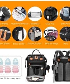 Mochila para pañales con estación de cambio conveniente. Diseño todo en uno que incluye una mochila para pañales, una estación de cambio, un cambiador lavable, un estuche para chupetes, un paño protector y correas de cochecito incorporadas. El tejido exterior e interior resistente al agua garantiza una organización limpia y sin desorden para todas las necesidades. Gran capacidad con 19 bolsillos diferentes. Dimensión de 16.5 x 8 x 13 pulgadas y 19 bolsillos diferentes, nuestra mochila para pañales ofrece un amplio espacio de almacenamiento para todos tus artículos esenciales. Desde pañales, biberones, ropa y toallitas hasta bolsos, teléfonos móviles e incluso los pantalones sucios del bebé, todo tiene su lugar dedicado. El bolsillo frontal tiene un revestimiento de papel de aluminio para mantener los biberones calientes, asegurando que tu bebé siempre tenga leche a la temperatura perfecta. Bolsillo antirrobo y diseño desmontable. El bolsillo trasero antirrobo puede guardar de forma segura tus objetos de valor. Correas de cochecito integradas para colgar sin esfuerzo tu bolso para bebé en cualquier cosa. La estación de cambio de pañales es desmontable, e incluso será un gran bolso de mano más allá de la edad de los niños pequeños. Puerto de carga USB y resistente al agua. Nuestra mochila de maternidad para pañales está hecha de tejido de poliéster ligero e impermeable. Incluye un forro resistente a derrames y fácil de limpiar. No tienes que preocuparte por la leche o el agua derramada. Además, cuenta con un puerto de carga USB y cable, lo que te permite cargar tu teléfono de forma conveniente (El banco de energía no está incluido). Regalo con estilo y considerado. Nuestro bolso para pañales no solo es una elección práctica, sino también un accesorio elegante. Su diseño unisex lo hace adecuado para tanto para mamás como para papás, y es un regalo ideal para la ducha del bebé para los nuevos padres. Ya sea en un baby shower, cumpleaños o cualquier otra ocasión, este bolso para pañales es un esencial imprescindible para recién nacidos que combina funcionalidad, durabilidad y estilo.