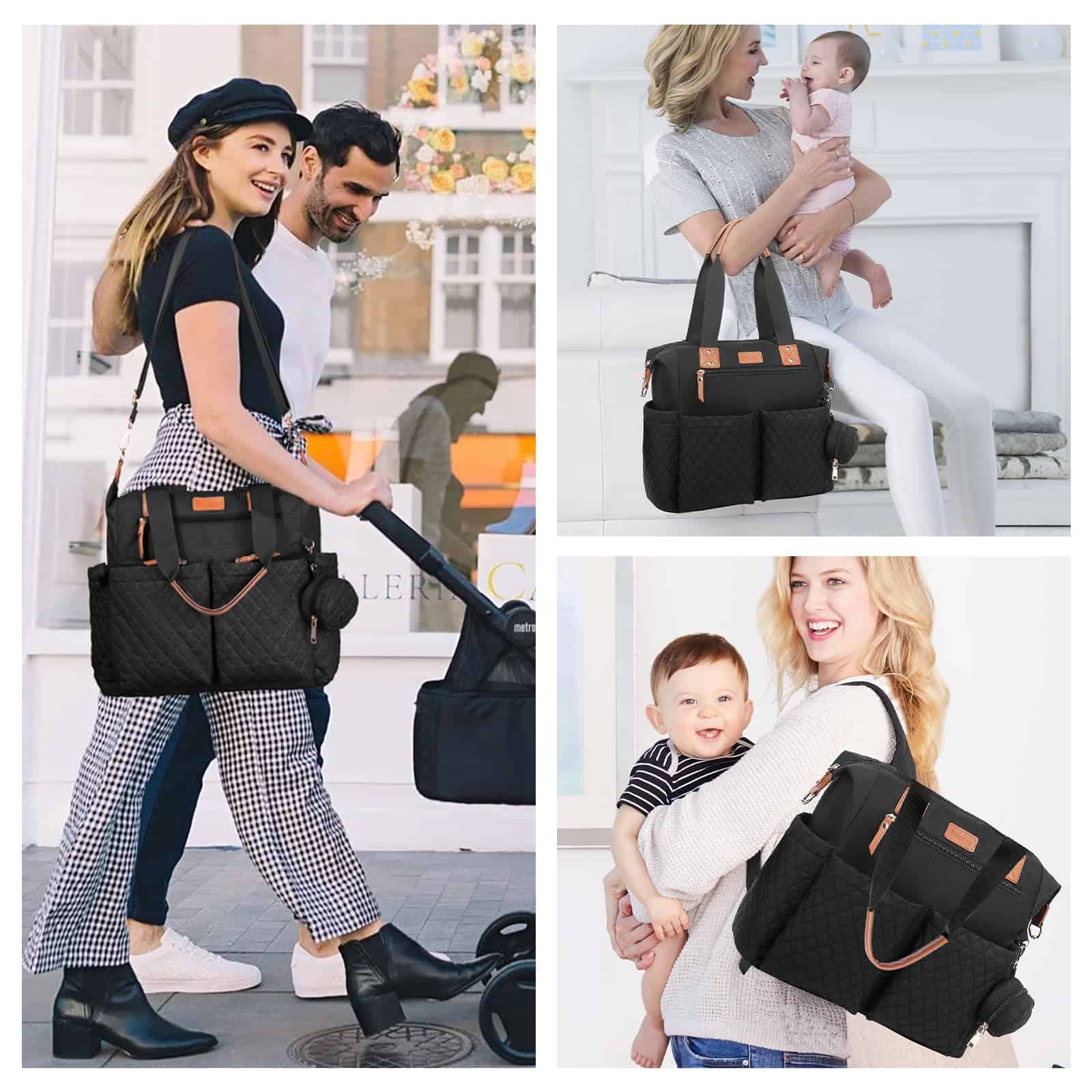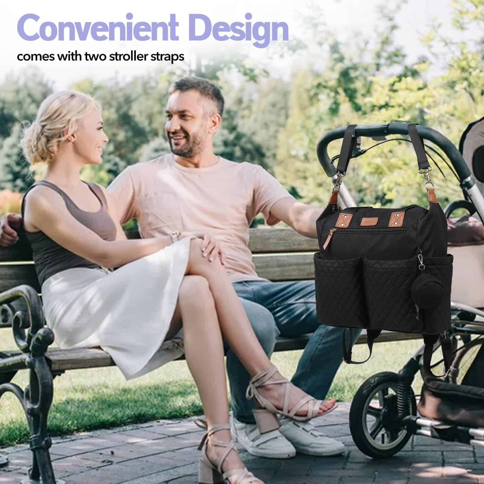 3. 3 Opciones de Transporte Esta práctica bolsa para pañales combina estilo y funcionalidad. Puede convertirse de una bolsa de hombro (la correa está incluida y se puede desmontar) a una mochila. Y 2 correas para cochecito extra fuertes permiten a las mamás colgar la bolsa de forma segura en los cochecitos, liberando las manos para el cuidado del bebé.