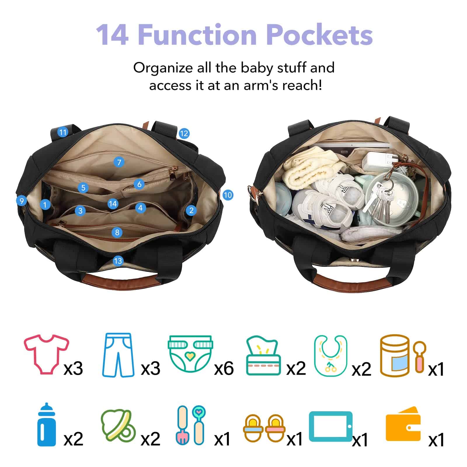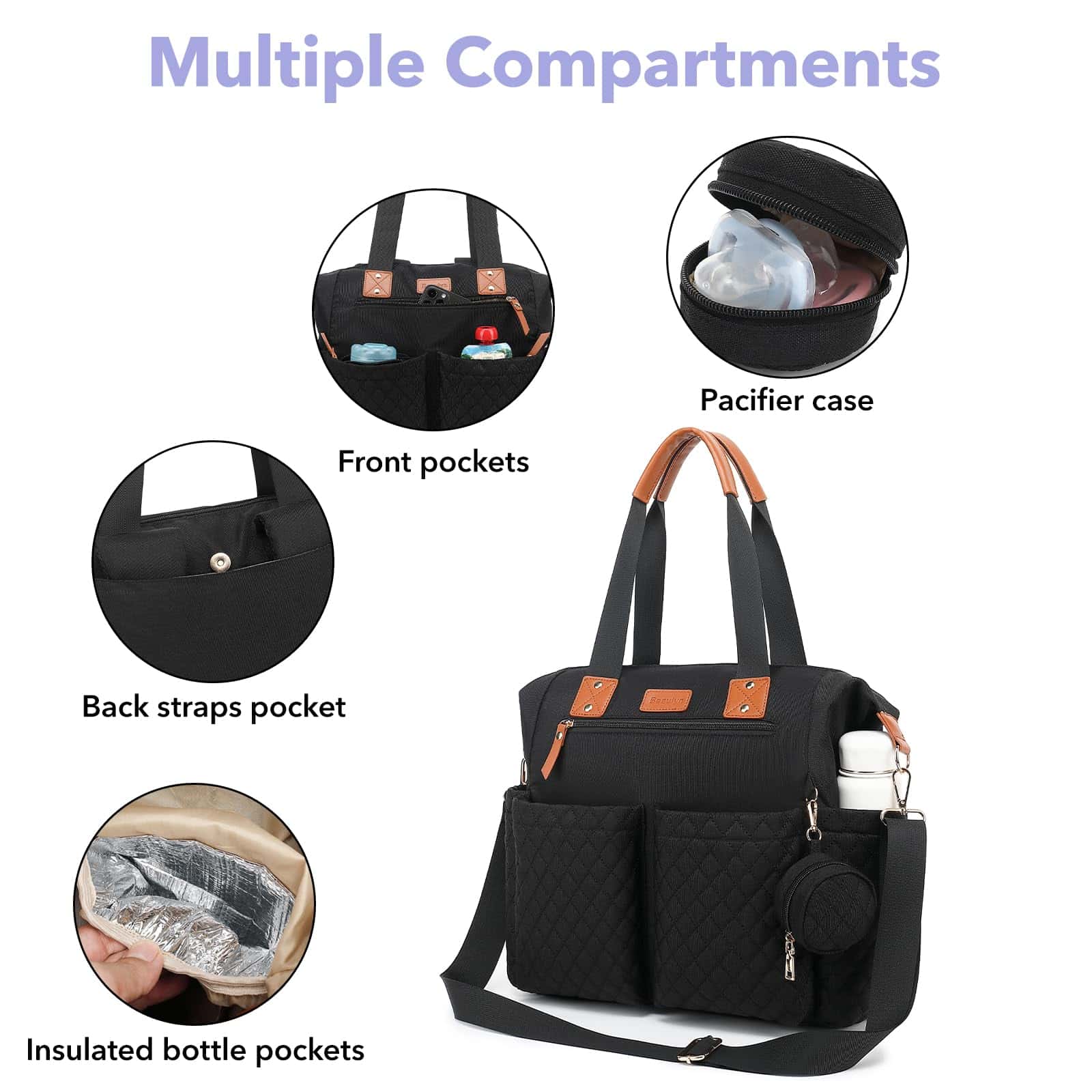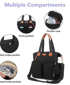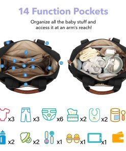 1. Bolsillos Múltiples 14 Bolsillos Funcionales, incluidos 6 Grandes y 2 Aislados, ¡no necesitas revolver más en el desorden! Con 6 bolsillos interiores grandes, 2 bolsillos aislados para biberones y bolsillos laterales profundos para toallitas o botellas de agua, cada artículo tiene su lugar. Diseñada para un acceso rápido, esta bolsa para pañales para mamá y papá contiene los elementos esenciales tanto para el bebé como para la mamá, desde pañales hasta bocadillos.