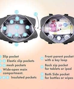 2. Amplio espacio de almacenamiento: Múltiples bolsillos para los artículos esenciales del bebé recién nacido, incluyendo un amplio compartimento principal con cierre de cremallera de doble dirección, un bolsillo delantero para padres con un lazo para llaves y un bolsillo trasero con cremallera para el almacenamiento rápido de artículos del bebé, 3 bolsillos aislados, 5 bolsillos de fácil acceso en el interior para botellas, pañales o toallitas. Dos bolsillos laterales con cierre magnético. Todo tiene su lugar adecuado.