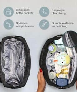 1. ¡ESPACIOSO Y ORGANIZADO! 1 compartimento principal, 14 bolsillos funcionales, 3 bolsillos aislados para mantener los elementos esenciales organizados. Este bolso para pañales multifunción puede contener todos los elementos esenciales del bebé como prendas infantiles, bocadillos y tiene un llavero para un fácil acceso.