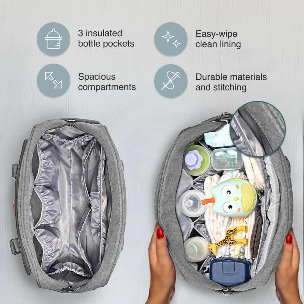 1. AMPLIO Y ORGANIZADO: 1 compartimento principal, 14 bolsillos y 3 bolsillos aislados mantienen los elementos esenciales organizados. Este amplio bolso para pañales de bebé puede almacenar desde la ropa de bebé hasta aperitivos, con un llavero para un fácil acceso.
