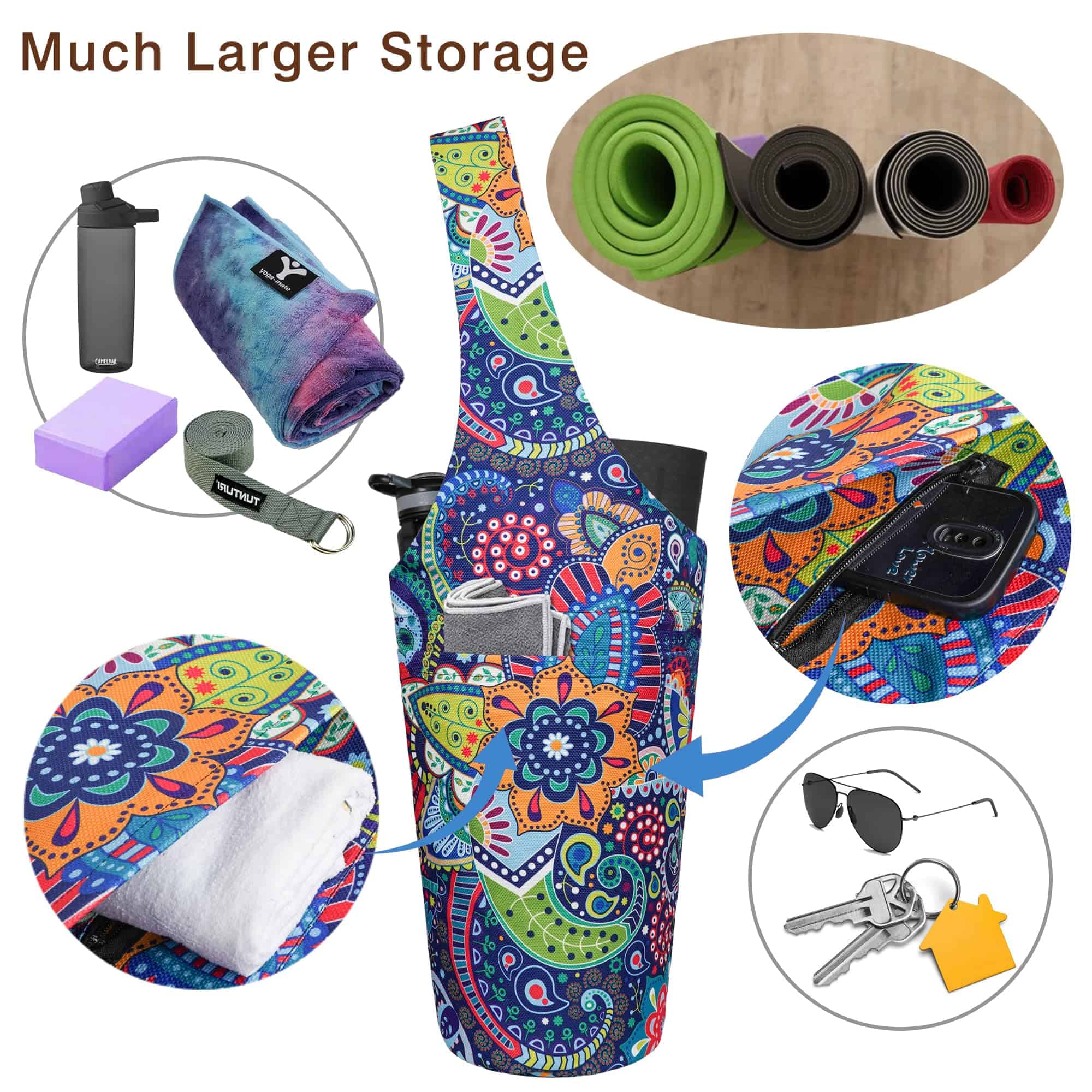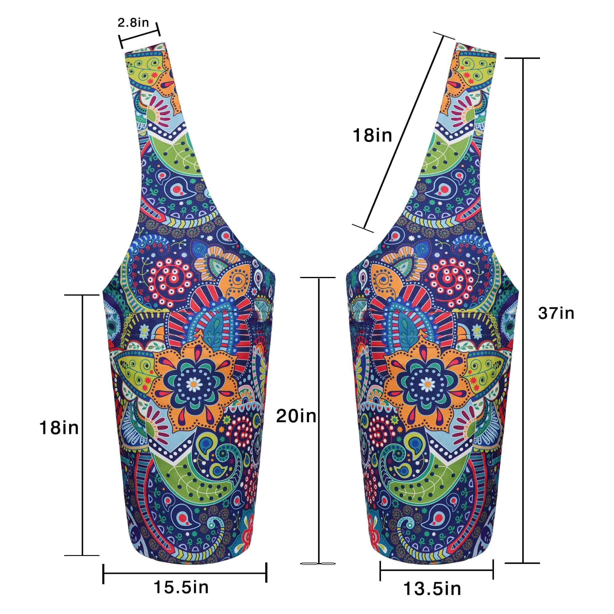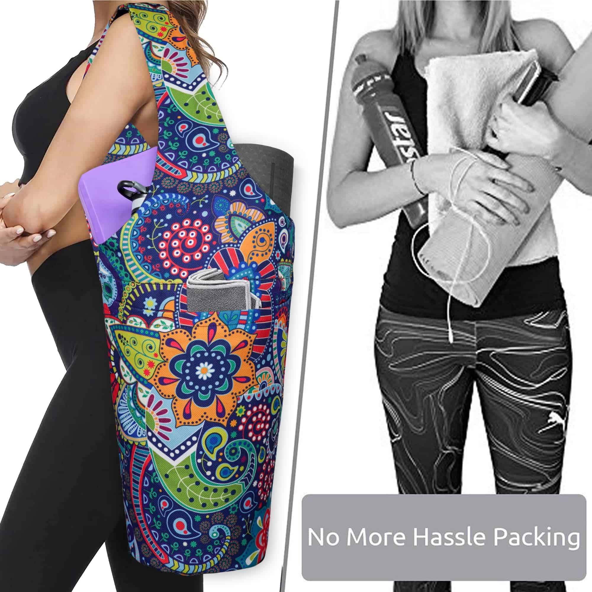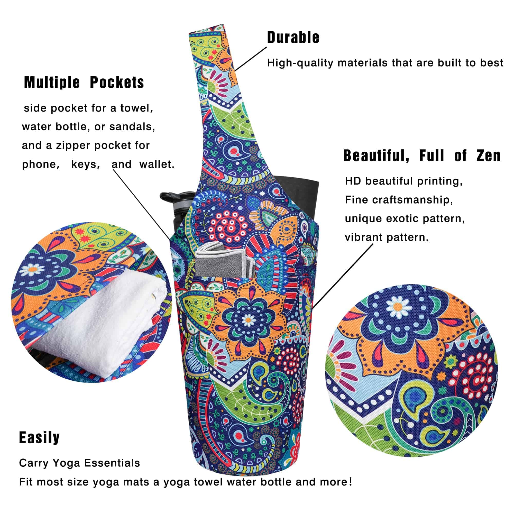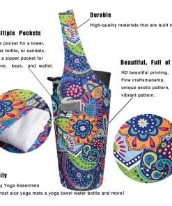4. Los bolsos para tapetes de yoga están hechos de materiales de alta calidad, sin sujetadores, sin hebillas y con una correa para el hombro cómoda. Combinado con costuras finas a mano, los diseños impresos del bolso agregan más color y valor a este bolso de yoga, vibrante y llamativo. Con las verdaderas necesidades de los yoguis en mente, este bolso de yoga aporta mucha comodidad en la organización diaria y almacenamiento de los accesorios de yoga, multifuncional y práctico. Un bolso de yoga versátil.