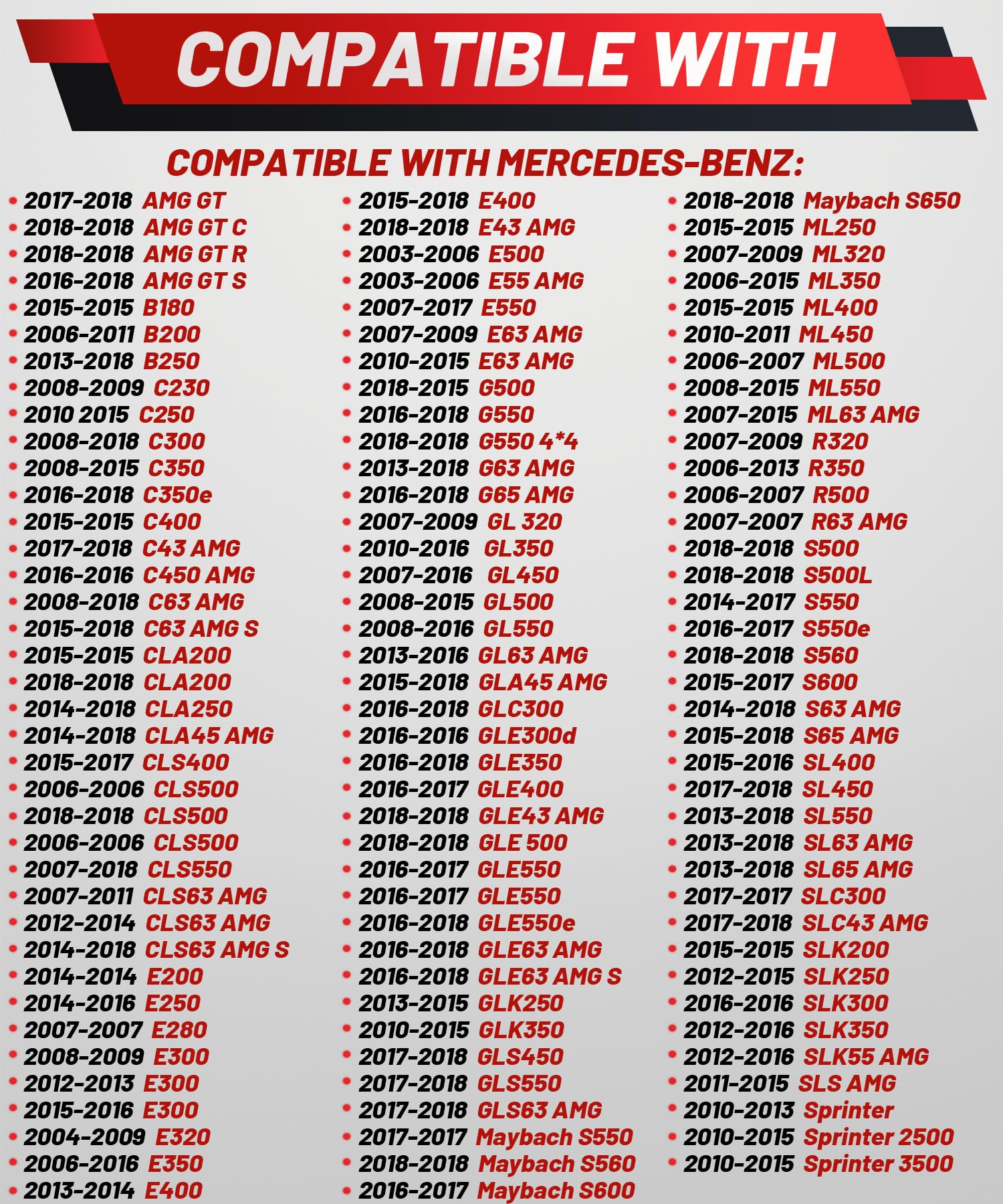 Fitment: Compatible con Benz CLS55 AMG 2006; Benz S63 AMG 2014-2017; Benz SLK55 AMG 2005-2016; Benz E550 2007-2013; Benz E550 2017; Benz GL550 2008-2012; Benz GL450 2007-2012; Benz ML550 2008-2011; Benz E55 AMG 2003-2006; Benz CLS550 2007-2011; Benz R550 2008; Benz C63 AMG 2008-2014; Benz C63 AMG 2017-2018; Benz C63 AMG S 2017-2018; Benz AMG GT S 2016-2019. (Para más modelos, por favor ver detalles en FITMENT como se detalla a continuación).