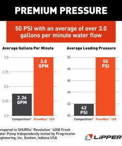 La bomba de agua Flow Max de Lippert Components proporciona un flujo constante de agua a su RV. En comparación con otras bombas de agua en el mercado, Flow Max ofrece un rendimiento de presión superior, con un promedio de 45 PSI y un flujo de agua promedio de 3.30 galones por minuto.