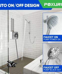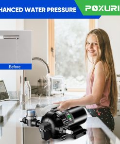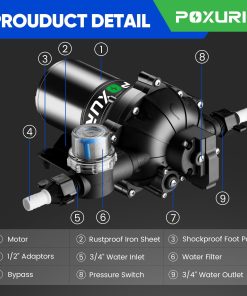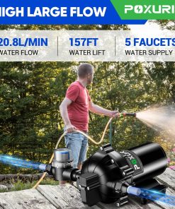 La bomba de agua para RV POXURIO con 5 cámaras se auto-ceba hasta 9.8 pies verticales y tiene una cabeza de hasta 157 pies. Tiene una gran capacidad de agua de 7 galones por minuto y puede conectar hasta 6 grifos a la vez para todas sus necesidades de agua. Viene con un interruptor de presión ajustable que permite que la bomba arranque y se detenga automáticamente cuando se abre y cierra el grifo para una operación más sencilla. Equipada con un motor 100% de cobre y patas de montaje de hierro antivibración que reducen eficazmente el ruido de funcionamiento. Con consumo de energía bajo y alto rendimiento, esta bomba puede ser ampliamente utilizada en jardín, yate, RV, casa, riego agrícola, lavado de autos u otras aplicaciones de bombeo a presión.