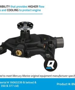La bomba de agua de repuesto con carcaza 8M0113734 es para motores V6 (número de serie 1A603239 y anteriores) y V8 (305, 350 y 377 cid) MerCruiser fabricados por General Motors. Consulta tu manual del propietario o manual de servicio para aplicaciones específicas e instrucciones de instalación. La marca Quicksilver es líder en la entrega de aceites, piezas y accesorios para motores a la industria marina durante más de 65 años. Quicksilver es el principal proveedor de repuestos de equipo original de Mercury Marine, pero también trabaja para atender a todas las marcas originales de la industria marina y de deportes de motor. Se ha ganado una fiel base de seguidores al proporcionar productos de la más alta calidad que han sido sometidos a algunos de los ambientes y procedimientos de prueba más rigurosos. Ninguna empresa de posventa se acerca al nivel de investigación y diseño de Quicksilver; comprar Quicksilver es comprar rendimiento, protección y tranquilidad.