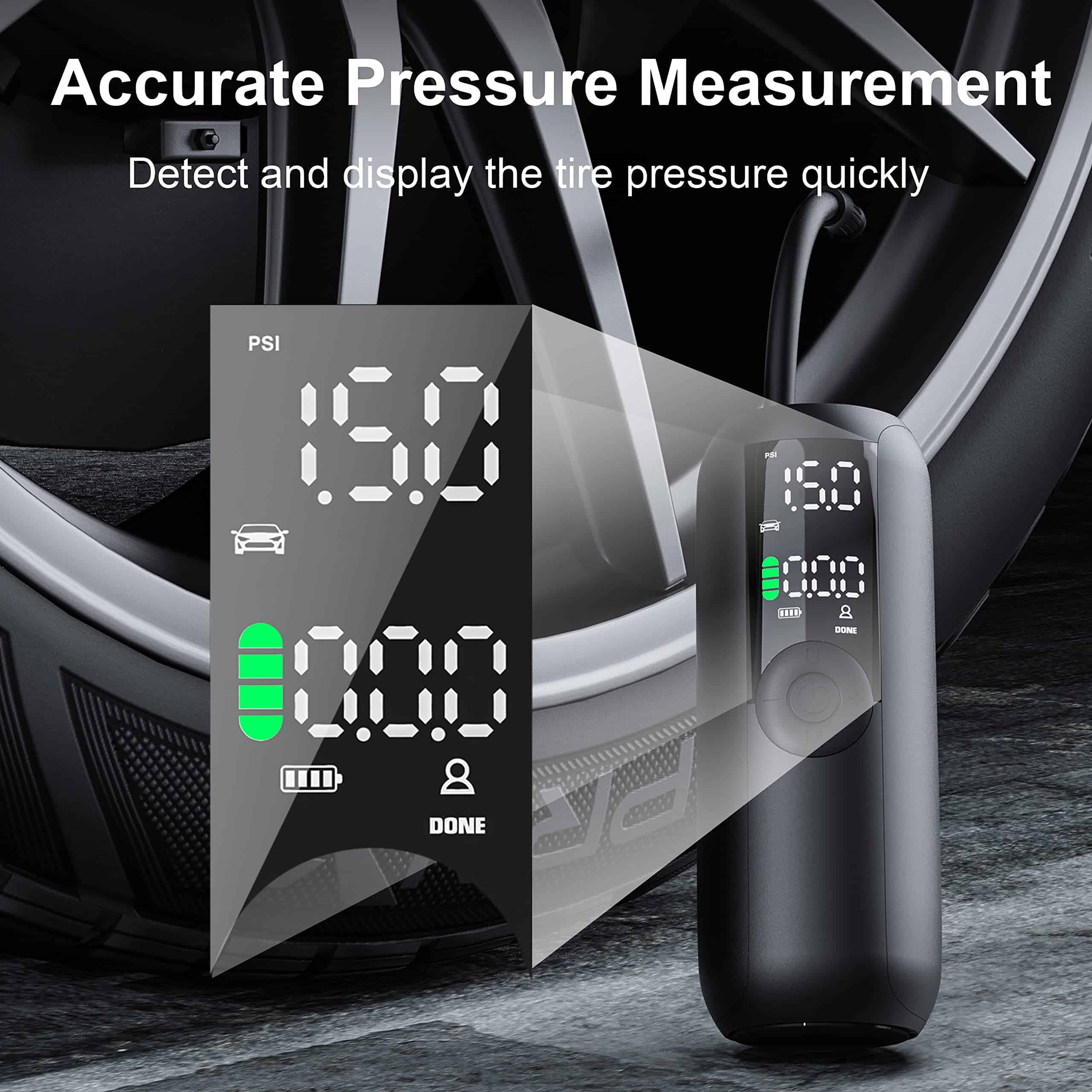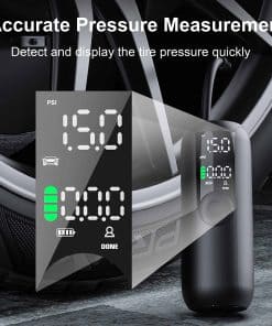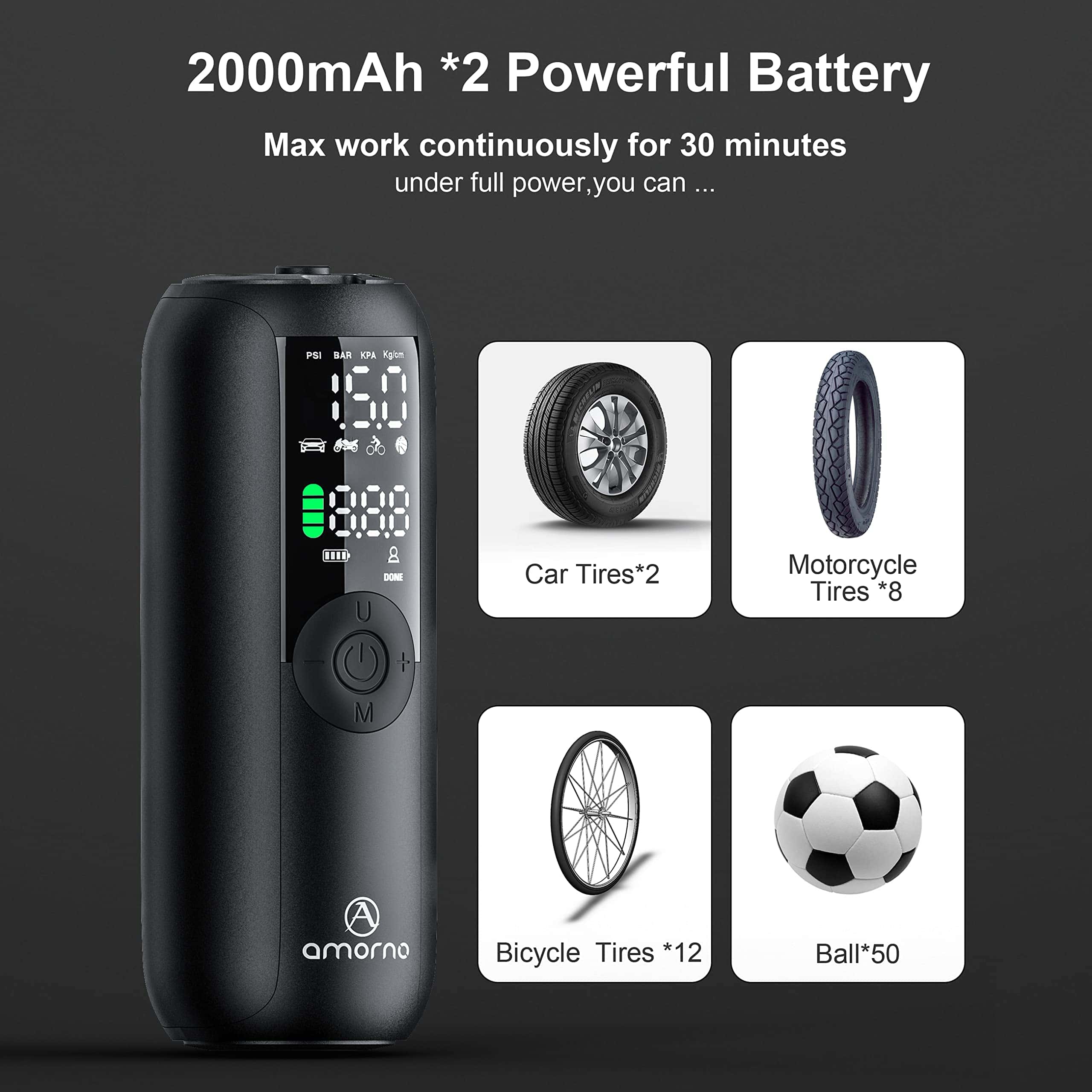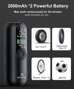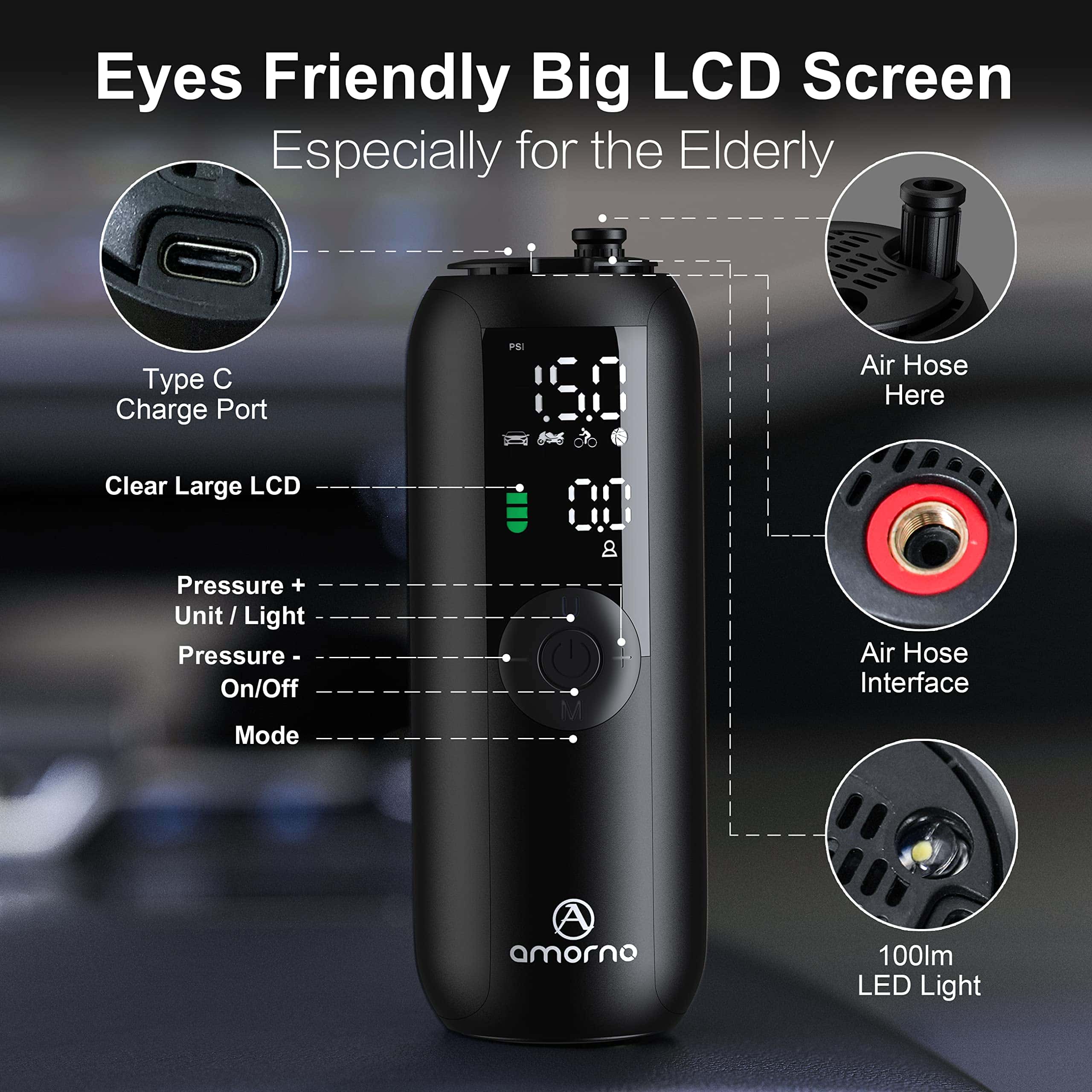 La Bomba de Aire Portátil Mini Compresor de Bicicleta AMORNO es una solución conveniente y versátil para inflar neumáticos de manera fácil y rápida. Con una capacidad de hasta 150 PSI, este inflador eléctrico de neumáticos cuenta con una pantalla digital LCD que muestra claramente la presión actual, permitiéndole monitorearla en todo momento. Además, la función de presión preestablecida garantiza una experiencia de inflado precisa y segura, deteniéndose automáticamente una vez alcanzado el valor deseado.