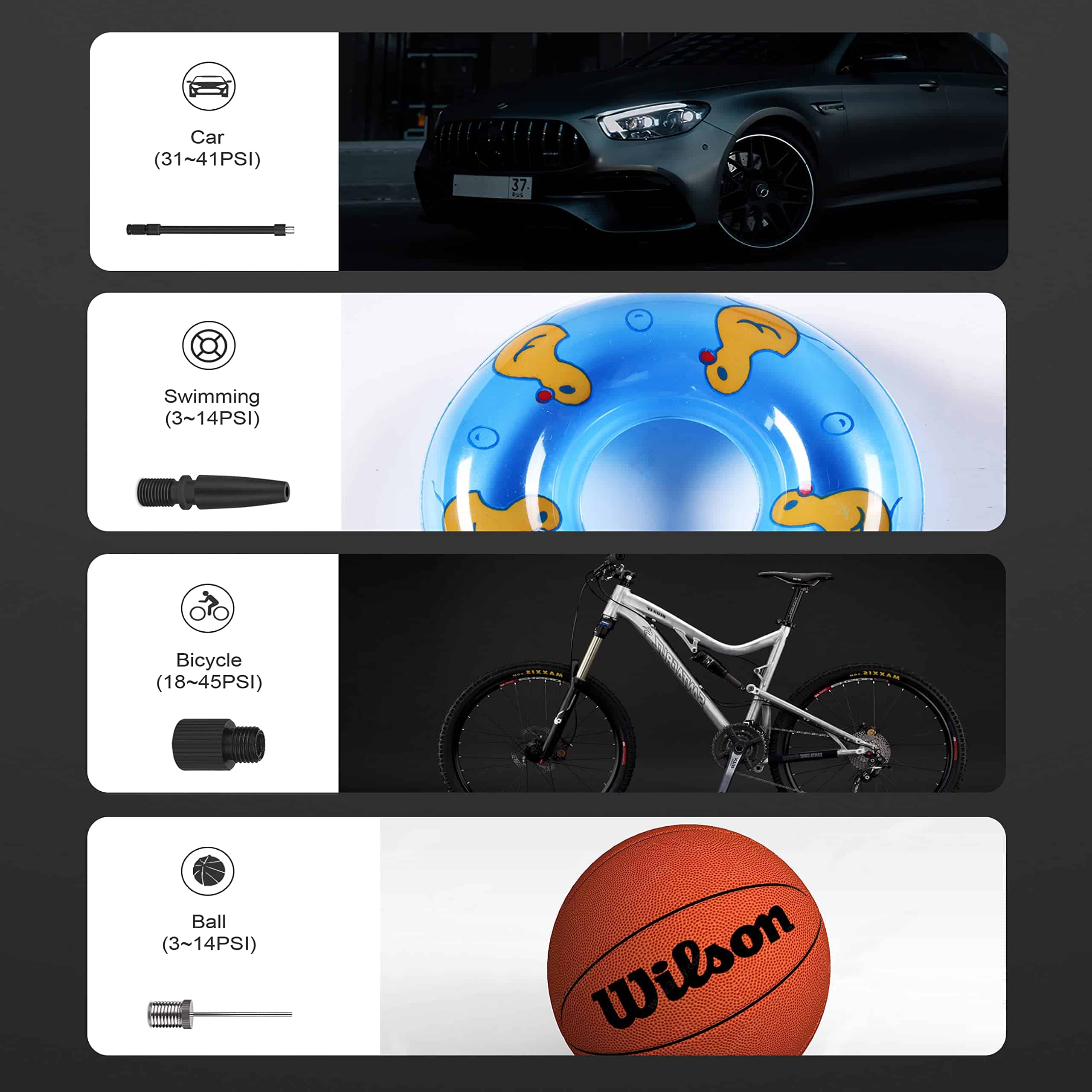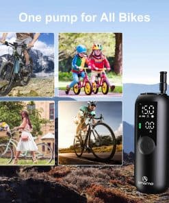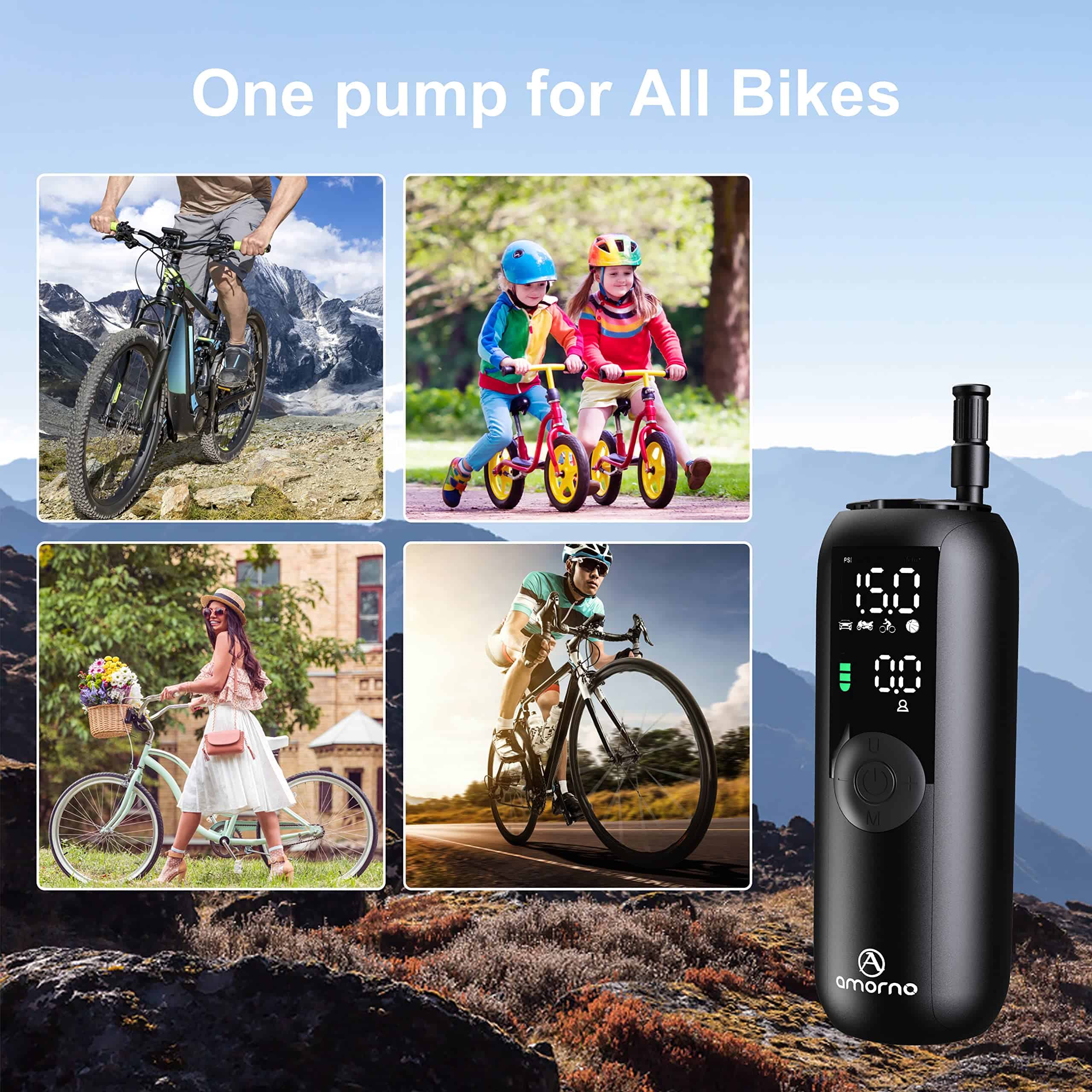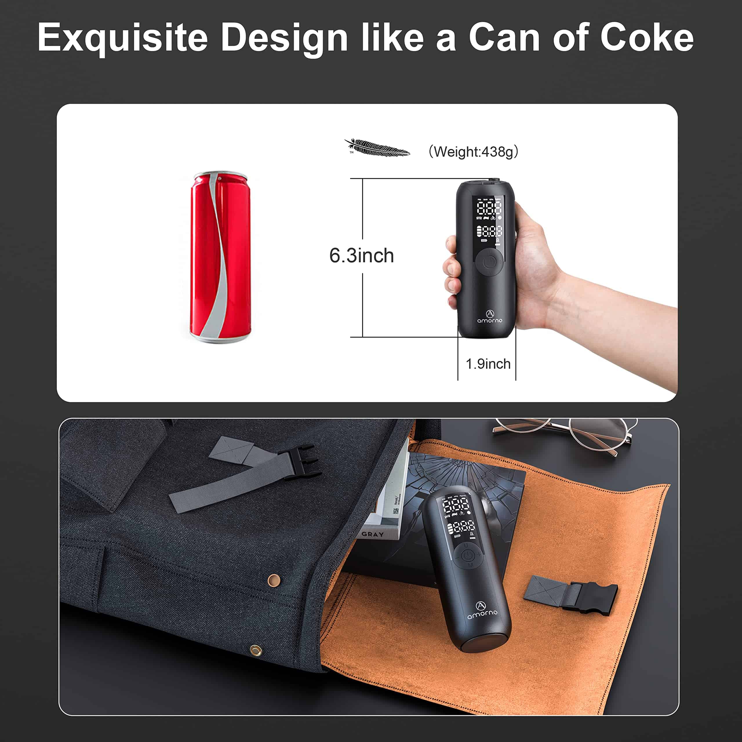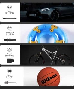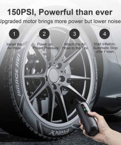 La Bomba de Aire Portátil Mini Compresor de Bicicleta AMORNO es una solución conveniente y versátil para inflar neumáticos de manera fácil y rápida. Con una capacidad de hasta 150 PSI, este inflador eléctrico de neumáticos cuenta con una pantalla digital LCD que muestra claramente la presión actual, permitiéndole monitorearla en todo momento. Además, la función de presión preestablecida garantiza una experiencia de inflado precisa y segura, deteniéndose automáticamente una vez alcanzado el valor deseado.