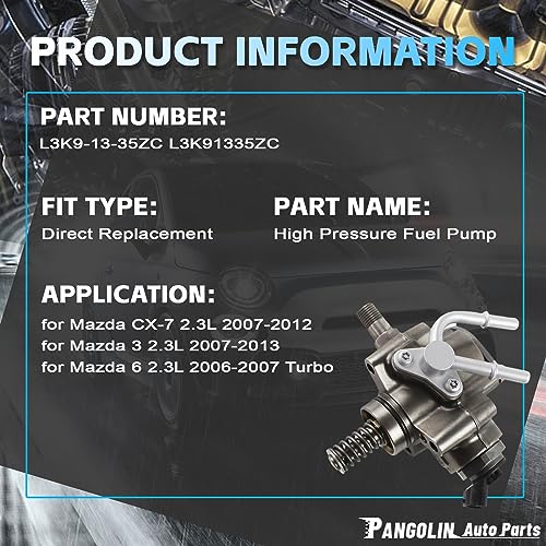 El producto presentado es la bomba de alta presión PANGOLIN L3K9-13-35ZC para varios modelos de Mazda, incluidos el Mazda CX-7 2.3L 2007-2012, Mazda 3 2.3L 2007-2013 y Mazda 6 2.3L 2006-2007. Esta bomba es un repuesto de mercado de posventa que se necesita para reemplazar cuando el seguidor de leva/tapeta del rodillo de la bomba de combustible se desgaste con el tiempo y afecte el funcionamiento de la bomba. La bomba de alta presión es esencial para la inyección directa, ya que comprime el combustible suministrado por la bomba de combustible eléctrica a la presión necesaria para la inyección de alta presión, proporcionando así la mezcla óptima de combustible y aire directamente en la cámara de combustión. Se ha remanufacturado y se ha diseñado para una operación de más de 10,000 horas o 100,000 millas. Se recomienda una instalación profesional para garantizar la seguridad y el buen uso del producto. Los clientes deben comparar cuidadosamente las imágenes o los números de equipo original antes de la compra y confirmar la información de Año/Fabricante/Modelo aplicable.