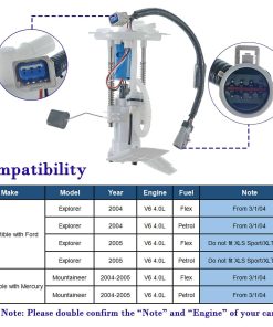 La bomba de combustible YHTAUTO para Ford Explorer y Mercury Mountaineer 2004-2005 V6 4.0L es un reemplazo directo de las piezas originales que cumple con las especificaciones OEM. Se ajusta perfectamente a los modelos mencionados, con excepción de las versiones XLS Sport y XLT Sport de 2005. Este producto cuenta con una garantía de calidad de 1 año sin límite de millas, brindando seguridad y confianza en su funcionamiento. El paquete incluye todos los componentes necesarios para una instalación sencilla y efectiva en su vehículo.