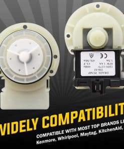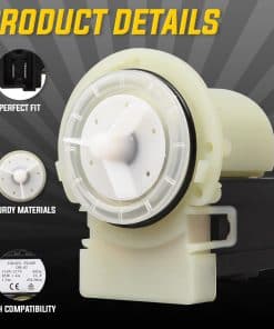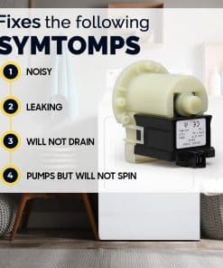La Bomba de desagüe 8181684 elimina el agua de la lavadora durante la fase de desagüe del ciclo y se activa después de que se ha mantenido la velocidad de centrifugado durante un período específico de tiempo. Esta pieza se utiliza en modelos de carga frontal. Desenchufa la lavadora antes de instalar esta pieza. Usa guantes de trabajo para proteger tus manos. Funciona con marcas de renombre: Whirlpool, Kenmore, KitchenAid, Maytag, Amana. Reemplaza los números de parte: 280187, 285998, 461970201671, 461970228511, 461970228512, 461970228513, 46197020148, 8181684, 8182819, 8182821, 1200164, AP3953640, PS1485610, EAP1485610. Funciona con los siguientes modelos: Whirlpool: 7MGHW9100MW0, 7MGHW9150PW0, 7MGHW9150PW1, 7MGHW9150PW2,. Kenmore: 11042822200, 11042822201, 11042822202, 11042822203, 11042822220, 11042824200, 11042824201. KitchenAid: KHWS01PMT1, KHWS01PMT2, KHWS01PMT3, KHWS01PWH0, KHWS02RMT0, KHWS02RMT1, KHWS02RMT2, etc. Una nueva bomba de desagüe para lavadoras puede solucionarlos: – La lavadora no se vaciará – La lavadora bombeará pero no girará – Ciclos ruidosos – La lavadora gotea Instrucciones para el reemplazo: Las herramientas necesarias para este proyecto de reparación son un cuchillo para masilla, destornillador Phillips y de punta plana, un driver de tuerca de 1/4 de pulgada y unos alicates de punta fina. 1. Desconecta toda la red eléctrica e hidráulica de la lavadora. 2. Vacía todo el contenido y también cualquier agua interna. 3. Desmonta la bomba de desagüe defectuosa del rodete/filtro/eje de la máquina incluyendo la conexión eléctrica e hidráulica. 4. Instala cuidadosamente en el mismo lugar la nueva bomba de desagüe con también la nueva junta, el soporte eventual y protección para el agua. 5. Ajusta los tornillos para evitar estropear los hilos. 6. Repara la conexión eléctrica e hidráulica para la bomba de desagüe, verificando y supervisando el correcto funcionamiento de la máqu