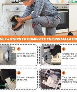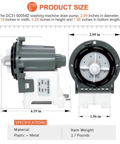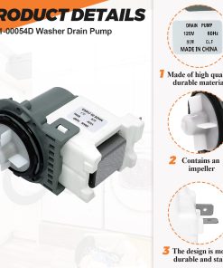 La bomba de desagüe de la lavadora se encuentra en la parte trasera de la misma y se encarga de expulsar el agua sucia durante el ciclo de enjuague. Esta bomba contiene un impulsor, lubricado con aceite de alta calidad para garantizar un funcionamiento silencioso. Reemplaza los números de parte 2754406, AP5583541, PS4204640, EAP4204640, px3516-01. Incluye 1 x bomba de desagüe para lavadora DC31-00054D. Esta bomba de alta calidad garantiza un rendimiento confiable y duradero. nCompatible con modelos de lavadoras Sam-sung en varias series como WF4, WF5, WF2, WF3, WA4 y WA5. Se recomienda usar guantes de trabajo y desconectar la alimentación antes de instalar la bomba. Las herramientas necesarias son un destornillador Phillips y cerraduras de ranura. Hazlo tú mismo siguiendo el video de reparación en YouTube para instalar la bomba de desagüe DC31-00054D correctamente.