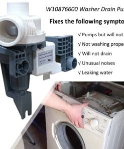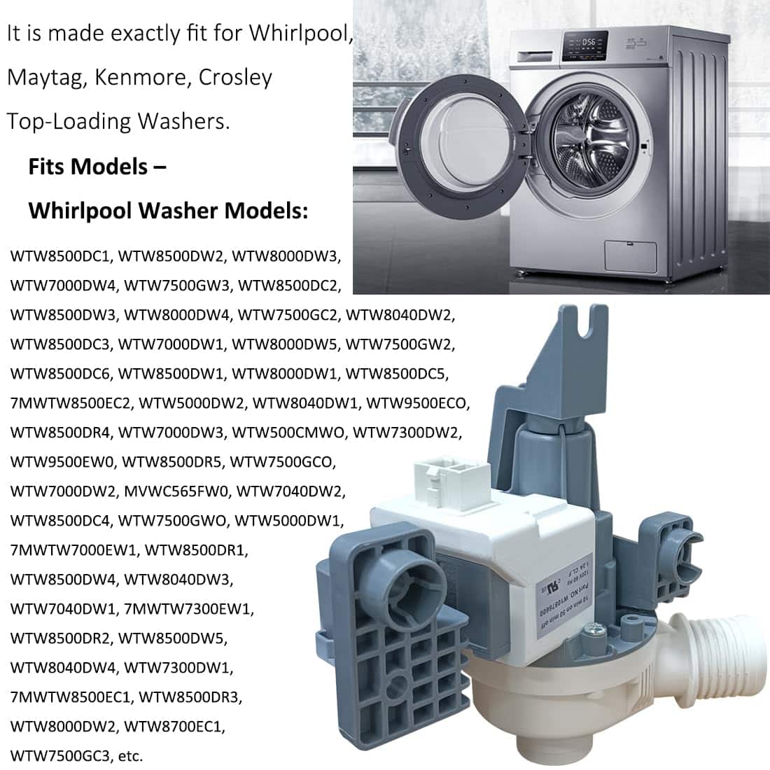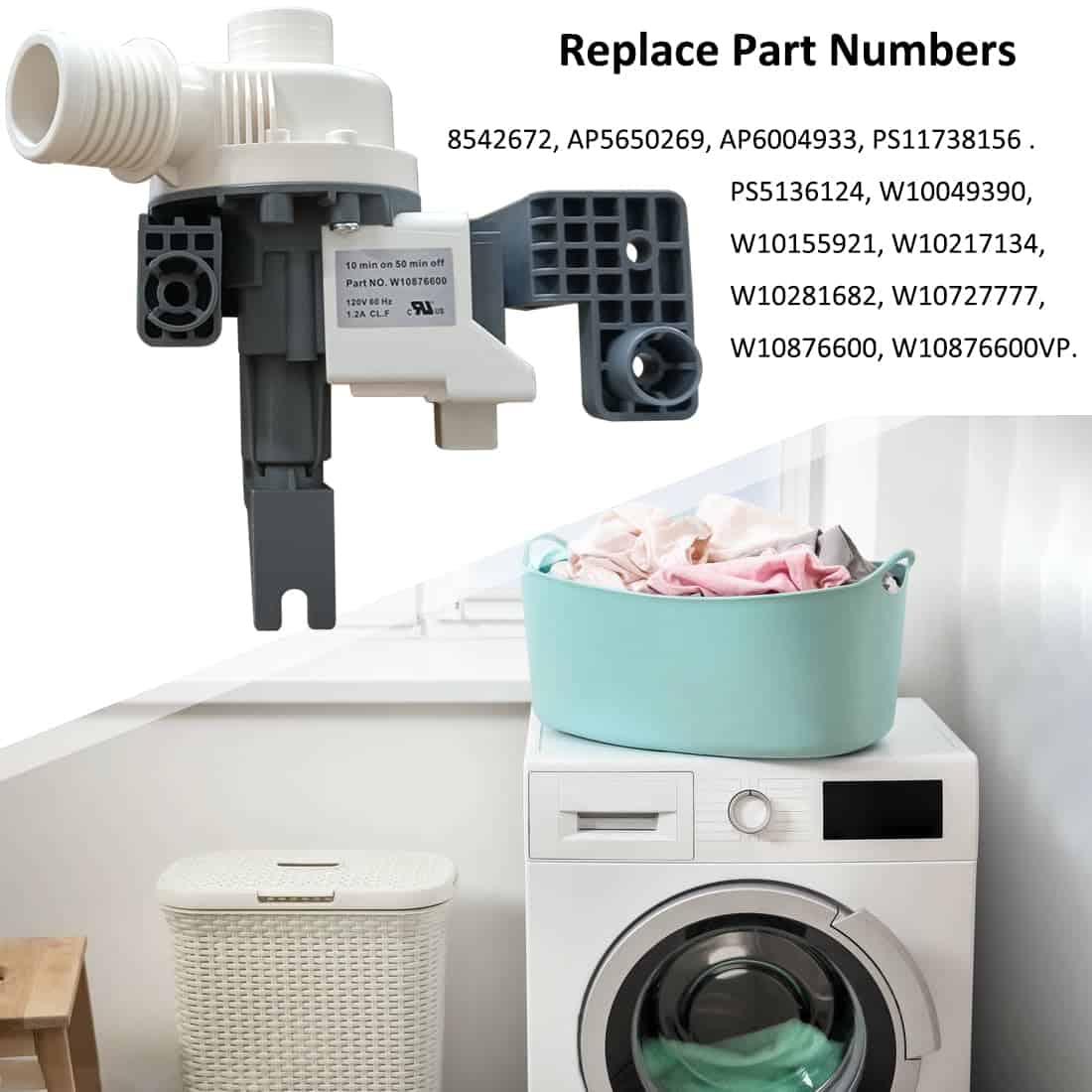 NÚMERO DE MODELO: Bomba de Desagüe de Lavadora W10536347. 1. La Bomba de Desagüe W10876600 puede resolver los siguientes problemas de la lavadora. 2. Problemas de Drenaje: la lavadora no drena correctamente o experimenta un drenaje lento. 3. Operación Ruidosa: Ruidos inusuales provenientes de la lavadora durante el ciclo de drenaje. 4. Fugas: Una lavadora que gotea puede ser el resultado de una bomba de drenaje defectuosa. Si hay agua acumulada alrededor de la lavadora o si hay fugas desde el área de la bomba. 5. Códigos de Error: Si recibe códigos de error relacionados con problemas de drenaje o falla de la bomba. Compatible con los modelos de lavadoras Whirlpool: WTW8500DC1, WTW8500DW2, WTW8000DW3, WTW7000DW4, WTW7500GW3, WTW8500DC2, WTW8500DW3, WTW8000DW4, WTW7500GC2, WTW8040DW2, WTW8500DC3, WTW7000DW1, WTW8000DW5, WTW7500GW2, WTW8500DC6, WTW8500DW1, WTW8000DW1, WTW8500DC5, 7MWTW8500EC2, WTW5000DW2, WTW8040DW1, WTW9500ECO, WTW8500DR4, WTW7000DW3, WTW500CMWO, WTW7300DW2, WTW9500EW0, WTW8500DR5, WTW7500GCO, WTW7000DW2, MVWC565FW0, WTW7040DW2, WTW8500DC4, WTW7500GWO, WTW5000DW1, 7MWTW7000EW1, WTW8500DR1, WTW8500DW4, WTW8040DW3, WTW7040DW1, 7MWTW7300EW1, WTW8500DR2, WTW8500DW5, WTW8040DW4, WTW7300DW1, 7MWTW8500EC1, WTW8500DR3, WTW8000DW2, WTW8700EC1, WTW7500GC3. Nota: 1. Estas son piezas de repuesto no originales. 2. Cualquier uso del nombre de marca o designación del modelo para este producto se realiza únicamente con fines de demostración de compatibilidad. 3. Estas son piezas de repuesto no originales. El producto no está patrocinado o respaldado por, ni afiliado a las marcas a las que se ajusta, incluidas Whirlpool, Maytag, Kenmore, Crosley.
