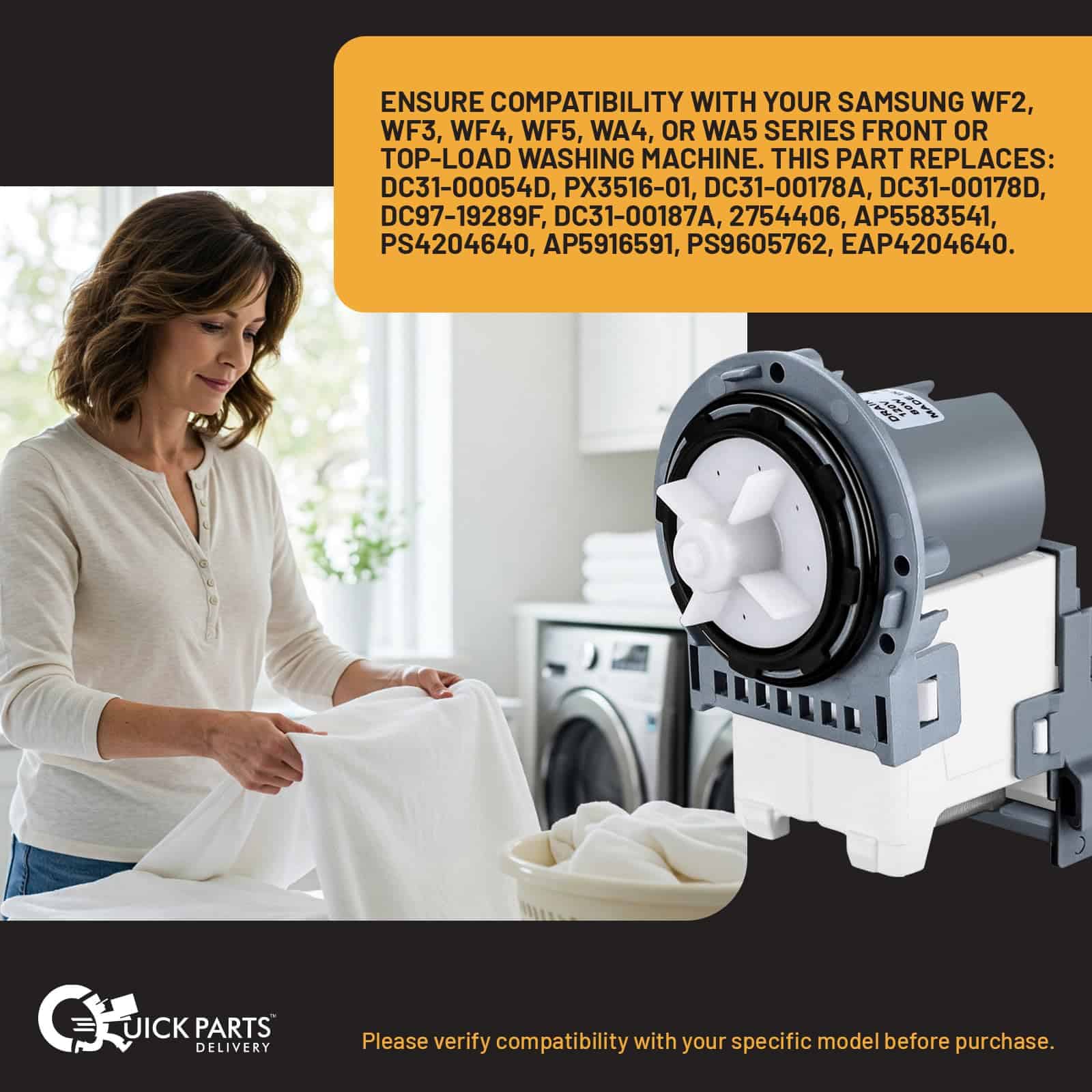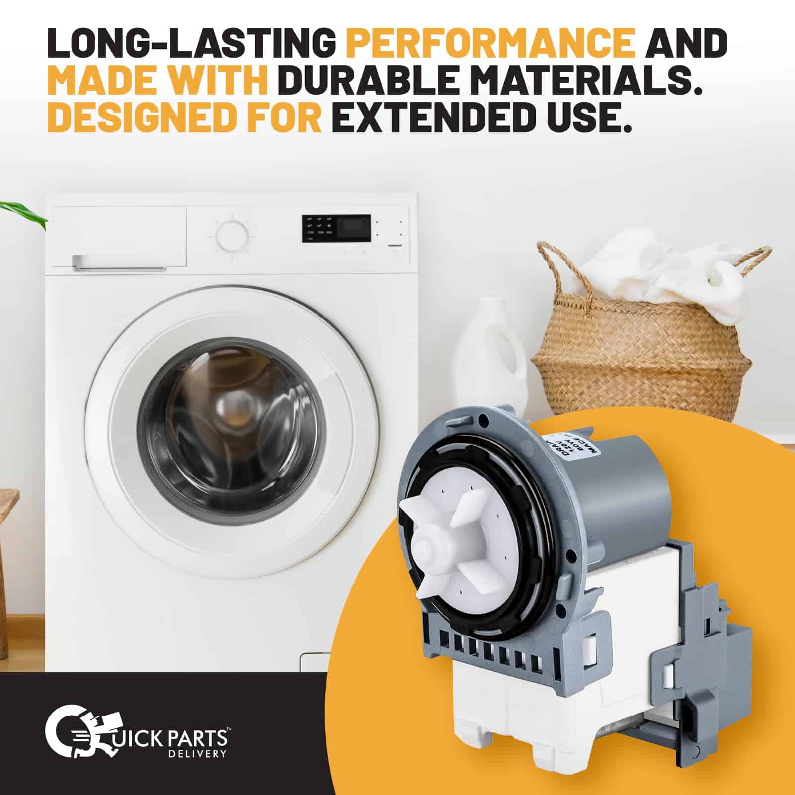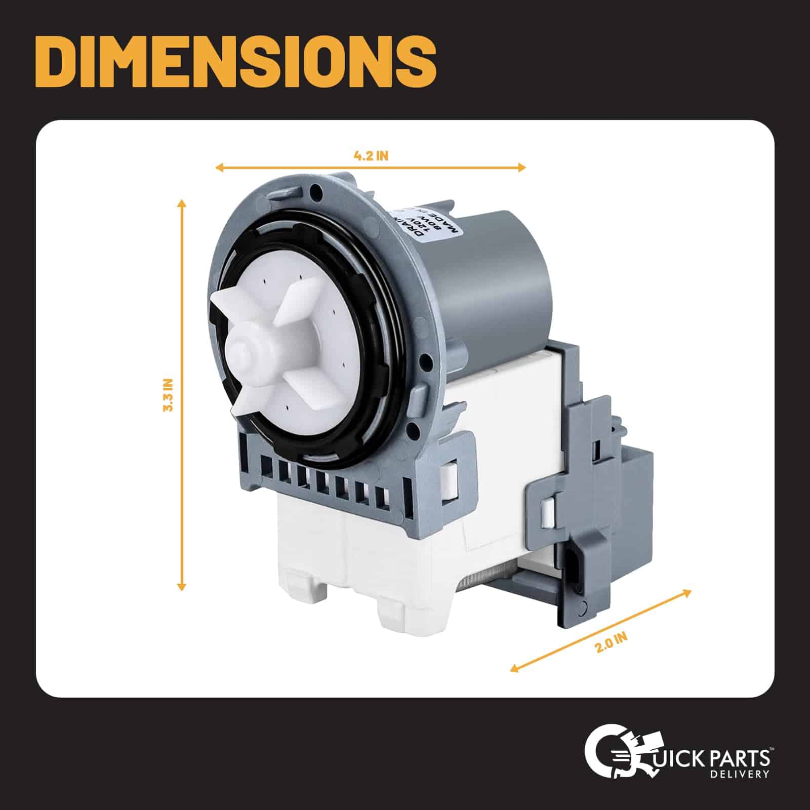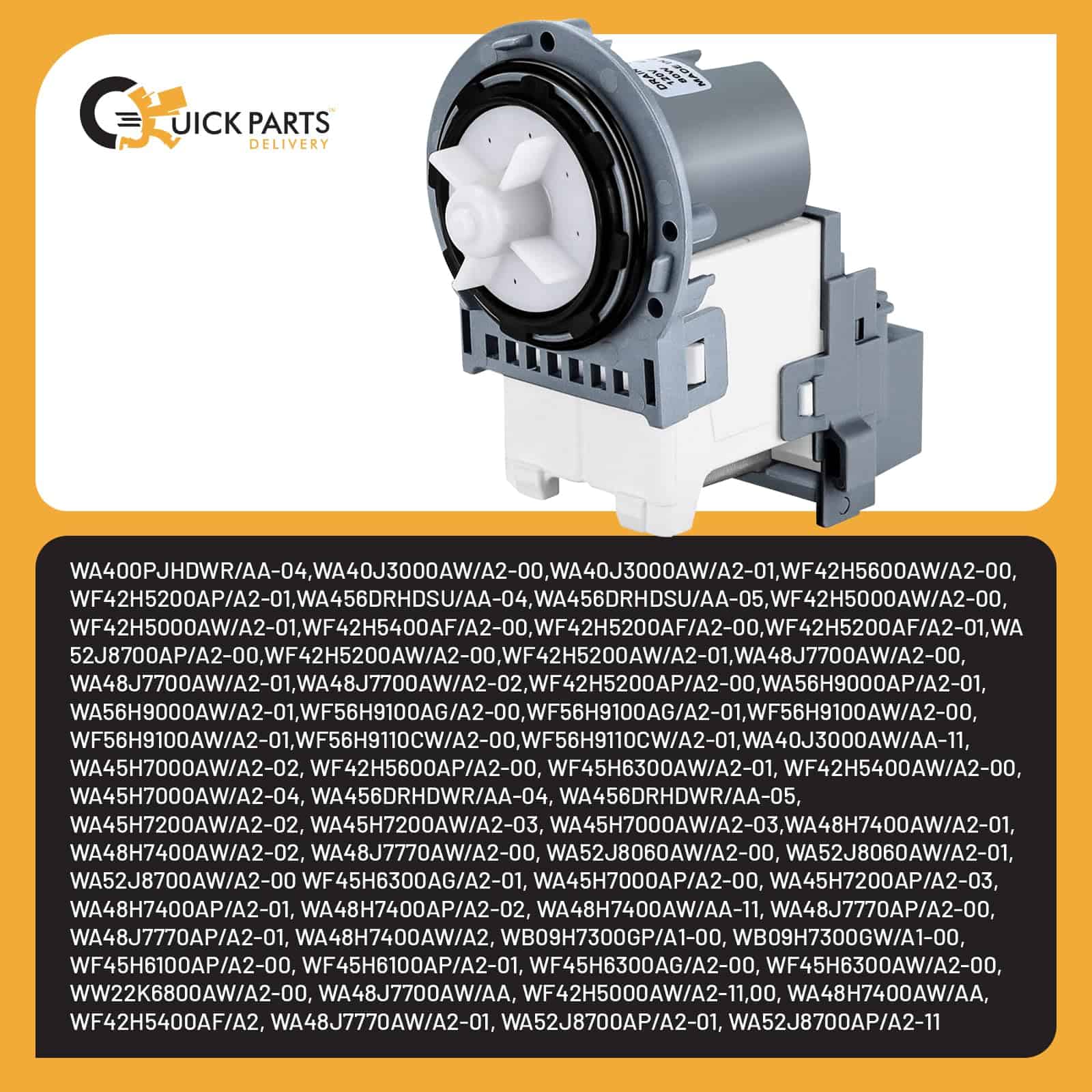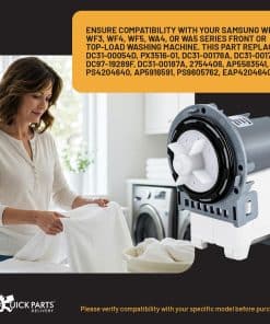 Experimenta un drenaje eficiente y confiable con esta bomba de desagüe de lavadora de alta calidad. Funcionando a 120V, 60Hz y 80W, esta bomba está diseñada para un rendimiento óptimo. Disfruta de una experiencia de lavandería más silenciosa con su operación suave y silenciosa, diseñada para minimizar el ruido y contribuir a un entorno doméstico más tranquilo. Esta bomba de desagüe está construida para una amplia compatibilidad, se adapta a varias lavadoras de carga frontal y carga superior dentro de las series WA4, WA5, WF2, WF3, WF4 y WF5. Es un reemplazo versátil, sirviendo como sustituto directo para múltiples números de parte, incluyendo DC97-19289F, DC31-00178D, DC97-20621A, 2754406, AP5583541, PS4204640, EAP4204640 y PX3516-01. Su ajuste a modelos extensos incluye numerosos modelos de lavadoras como WA400PJHDWR/AA-04, WA40J3000AW/A2-00, WA40J3000AW/A2-01, WF42H5600AW/A2-00, WF42H5200AP/A2-01, WA456DRHDSU/AA-04, WA456DRHDSU/AA-05, WF42H5000AW/A2-00, WF42H5000AW/A2-01, WF42H5400AF/A2-00, WF42H5200AF/A2-00, WF42H5200AF/A2-01, WA52J8700AP/A2-00, WF42H5200AW/A2-00, WF42H5200AW/A2-01, WA48J7700AW/A2-00, WA48J7700AW/A2-01, WA48J7700AW/A2-02, WF42H5200AP/A2-00, WA56H9000AP/A2-01, WA56H9000AW/A2-01, WF56H9100AG/A2-00, WF56H9100AG/A2-01, WF56H9100AW/A2-00, WF56H9100AW/A2-01, WF56H9110CW/A2-00, WF56H9110CW/A2-01, WA40J3000AW/AA-11, WA45H7000AW/A2-02, WF42H5600AP/A2-00, WF45H6300AW/A2-01, WF42H5400AW/A2-00, WA45H7000AW/A2-04, WA456DRHDWR/AA-04, WA456DRHDWR/AA-05, WA45H7200AW/A2-02, WA45H7200AW/A2-03, WA45H7000AW/A2-03, WA48H7400AW/A2-01, WA48H7400AW/A2-02, WA48J7770AW/A2-00, WA52J8060AW/A2-00, WA52J8060AW/A2-01, WA52J8700AW/A2-00, WF45H6300AG/A2-01, WA45H7000AP/A2-00, WA45H7200AP/A2-03, WA48H7400AP/A2-01, WA48H7400AP/A2-02, WA48H7400AW/AA-11, WA48J7770AP/A2-00, WA48J7770AP/A2-01, WA48H7400AW/A2, WB09H7300GP/A1-00, WB09H7300GW/A1-00, WF45H6100AP/A2-00, WF45H6100AP/A2-01, WF45H6300AG/A2-00, WF45H6300AW/A2-00, WW22K6800AW/A2-00, WA48J7700AW/AA, WF42H5000AW/A2-11,00, WA48H7400AW/AA, WF42H5400AF/A2, WA48J7770AW/A2-01, WA52J8700AP/A2-01, WA52J8700AP/A2-11.