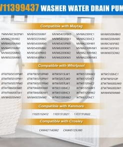 Modelos de lavadoras compatibles: La bomba de desagüe para lavadora W11399437 es compatible con varios modelos de lavadoras Maytag, Whirlpool, Crosley, y Kenmore, entre otros.