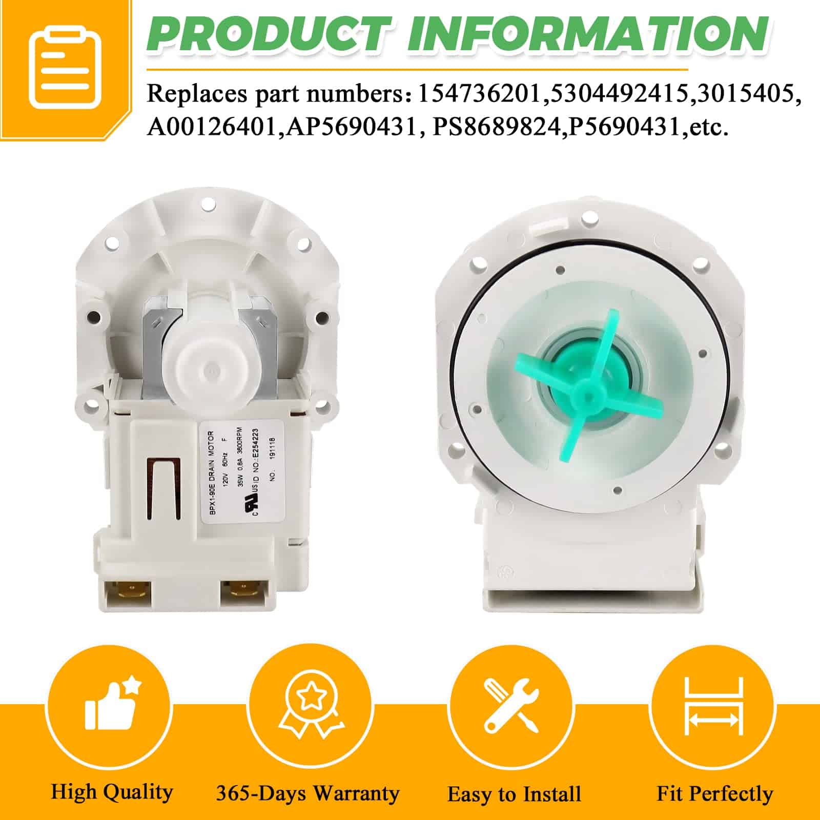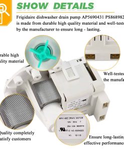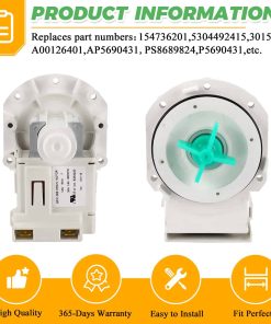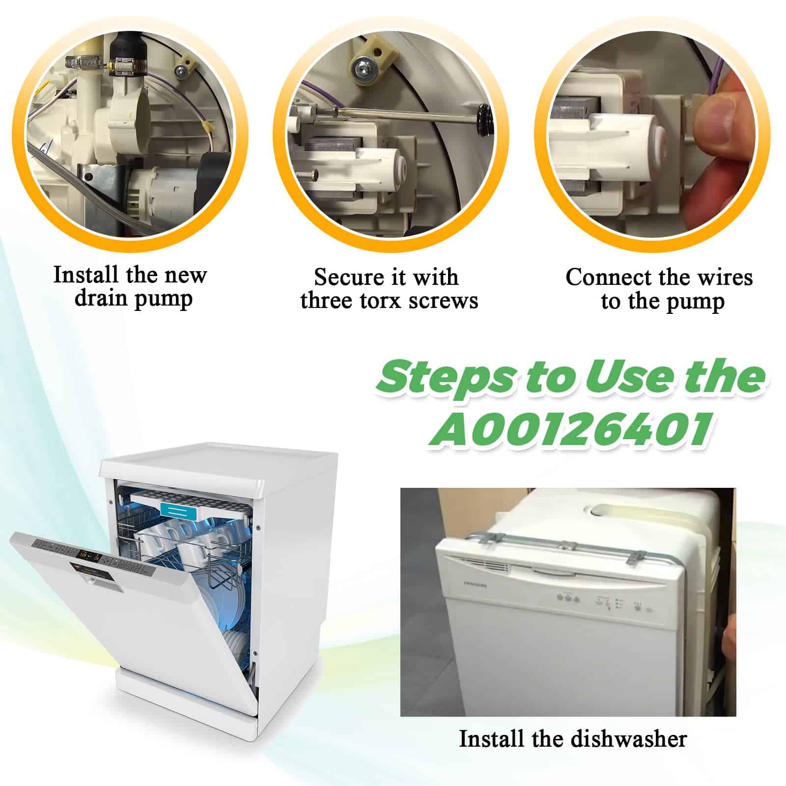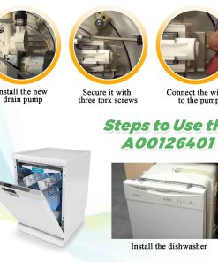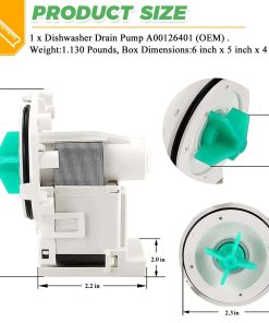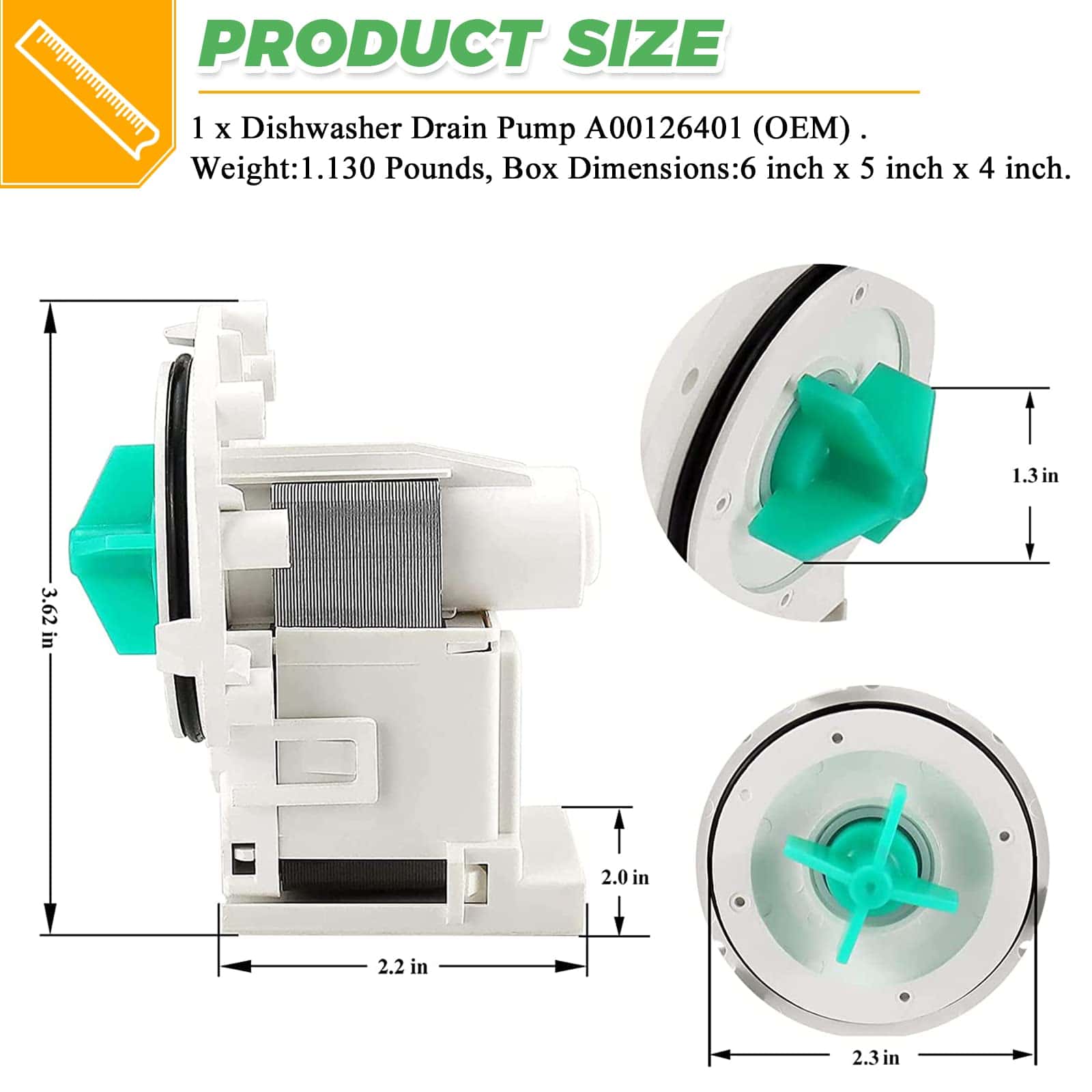 La bomba de desagüe A00126401 elimina el agua de la tina del lavaplatos durante la fase de drenaje del ciclo de lavado de platos. La bomba de desagüe fuerza el agua a través de la manguera de desagüe. Puedes reemplazar la bomba de desagüe del lavaplatos si está obstruida, dañada o defectuosa, el lavaplatos no se vaciará adecuadamente. El paquete incluye: 1 x Bomba de Desagüe A00126401 para lavaplatos. Peso: 1.130 libras, Dimensiones de la caja: 6 pulgadas x 5 pulgadas x 4 pulgadas. Síntomas aplicables: el lavaplatos no inicia. El lavaplatos no lava correctamente. El lavaplatos no se vacía. El lavaplatos tiene fugas. Pasos de instalación: 1. Apagar y desconectar la línea de agua y la manguera de desagüe que llevaban al lavaplatos debajo de mi fregadero, y apagar el interruptor del lavaplatos como precaución. 2. Luego retire los tornillos de dos soportes en L adjuntos en la parte superior del lavaplatos sobre la puerta hasta la parte inferior de la encimera. 3. Tire del cableado hasta el final y gírelo para facilitar el acceso a la bomba de abajo. 4. Hay dos cables insertados con enchufes en la bomba, retire tirando suavemente de ellos. 5. Luego coloque una toalla debajo de la bomba en previsión de que libere algo de agua al quitarla. Se retiraron 3 tornillos torx-20 de la cara de la bomba que permitieron que se retirara fácilmente manualmente. 6. Después de quitar la antigua, reemplácela por una nueva e instale todo de nuevo como estaba. Modelo reemplazable: Frigidaire—FFID2423RS4B, FGID2466QB5A, FGID2466QF5A, FGID2466QW5A, DGBD2432KB0, DGBD2432KF0, DGBD2432KW0, DGBD2438PF8B, DGHD2433KF0, FBD2400KS3B, FBD2400KS4B, FBD2400KS5B, FBD2400KS6B, FBD2400KS7B, FBD2400KW5B, FFBD2404NQ0A, FFBD2404NS0A, FFBD2404NS1A, FFBD2404NS2A Kenmore—58714012409B, 58714012410B, 58714012411B, 58714012412B, 58714012413B, 58714012414B, 58714013410B, 58714013411B, 58714013412B, 58714013413B, 58714013414B, 58714014409B, 5871401441