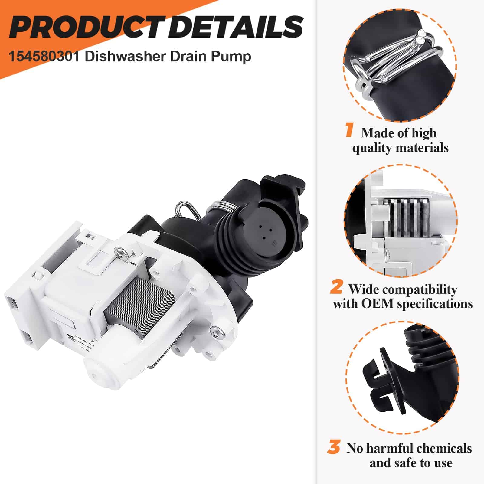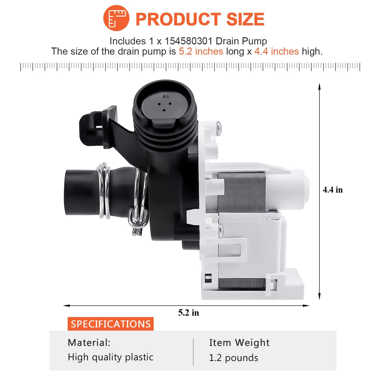 Nombre del producto: Motor de bomba de desagüe 154580301. El motor de bomba de desagüe 154580301 está hecho de material duradero y de alta calidad, probado por el fabricante, elimina el agua de la tina del lavavajillas durante la fase de drenaje del ciclo del lavavajillas. Paquete incluye: Motor de bomba de desagüe 154580301 Fácil de instalar: Desconecte el lavavajillas y cierre el suministro de agua antes de instalar esta pieza. Use guantes de trabajo para proteger sus manos. Marca compatible: Motor de bomba de desagüe 154580301 de repuesto para modelos de lavadoras y lavavajillas Kenmore. Pieza de repuesto: Kenmore FDB1200RGB0, FDB1200RGB1, FDB1200RGB2, FDB1200RGC0, FDB1200RGC1, FDB1200RGC2, FDB1200RGQ0 y más. Soluciona síntomas comunes: Soluciona el problema de las filtraciones. TENGA EN CUENTA: El nombre de la marca o la designación del modelo de este producto se hace únicamente con fines de demostrar compatibilidad. Gracias.