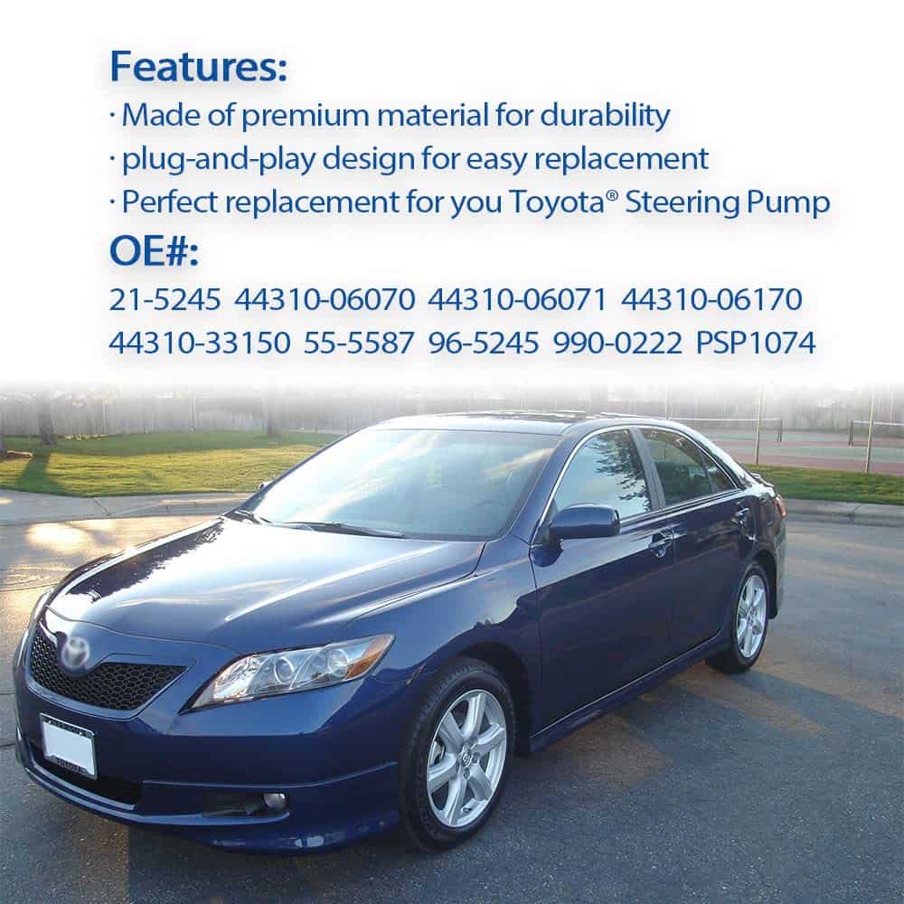Descripción Esta es una bomba de dirección asistida compatible de repuesto fabricada por CHargo. Los materiales de calidad utilizados cumplen o superan los estándares OEM, se garantiza que son nuevos, 100% probados antes del envío. Se recomienda encarecidamente enjuagar el sistema antes de instalar la bomba de dirección asistida. Compatible con motor 2.4L: Camry 2.4L 2002-2009 Solara 2.4L 2002-2008 Reemplaza el número de parte OEM: 21-5245 44310-06070 44310-06071 44310-06170 44310-33150 55-5587 96-5245 990-0222 PSP1074 El paquete incluye: 1x Bomba de Dirección Asistida