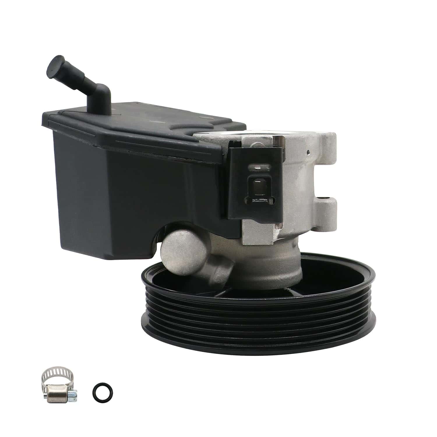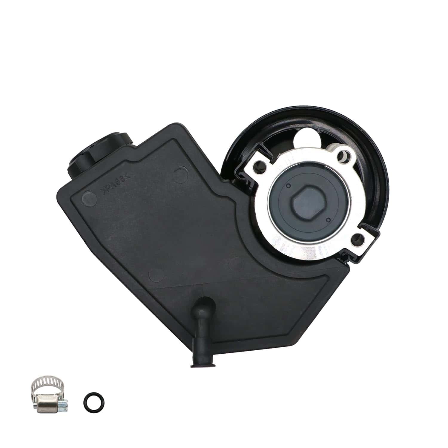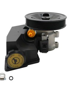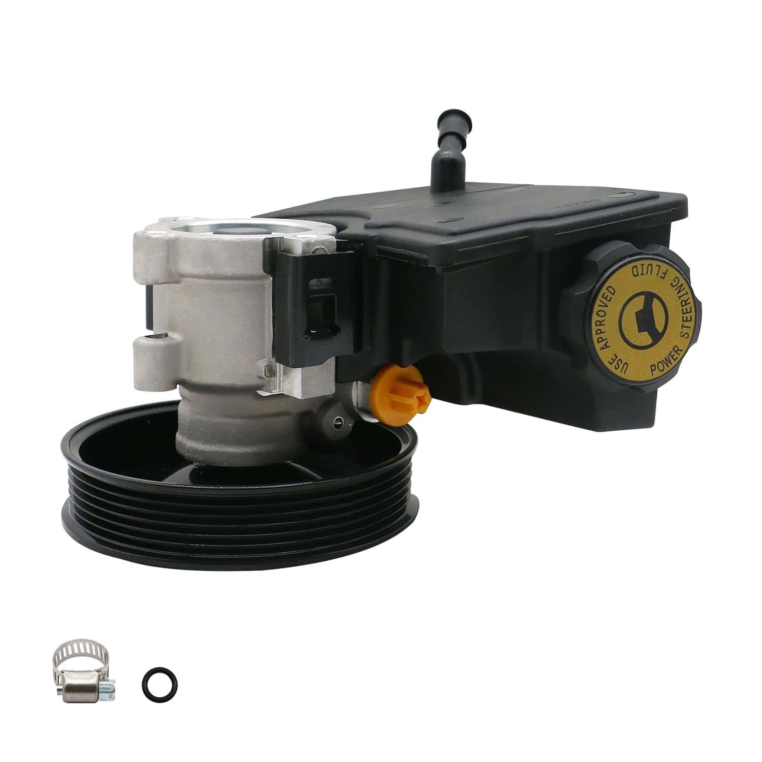 5. Paquete: Bomba de dirección asistida 20-38771 con polea, depósito, anillo en O adicional y abrazadera empaquetados en una caja de color.