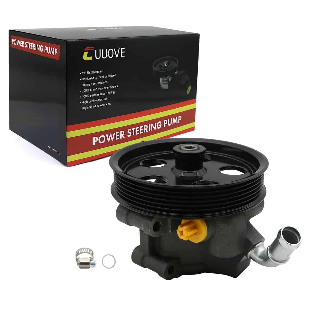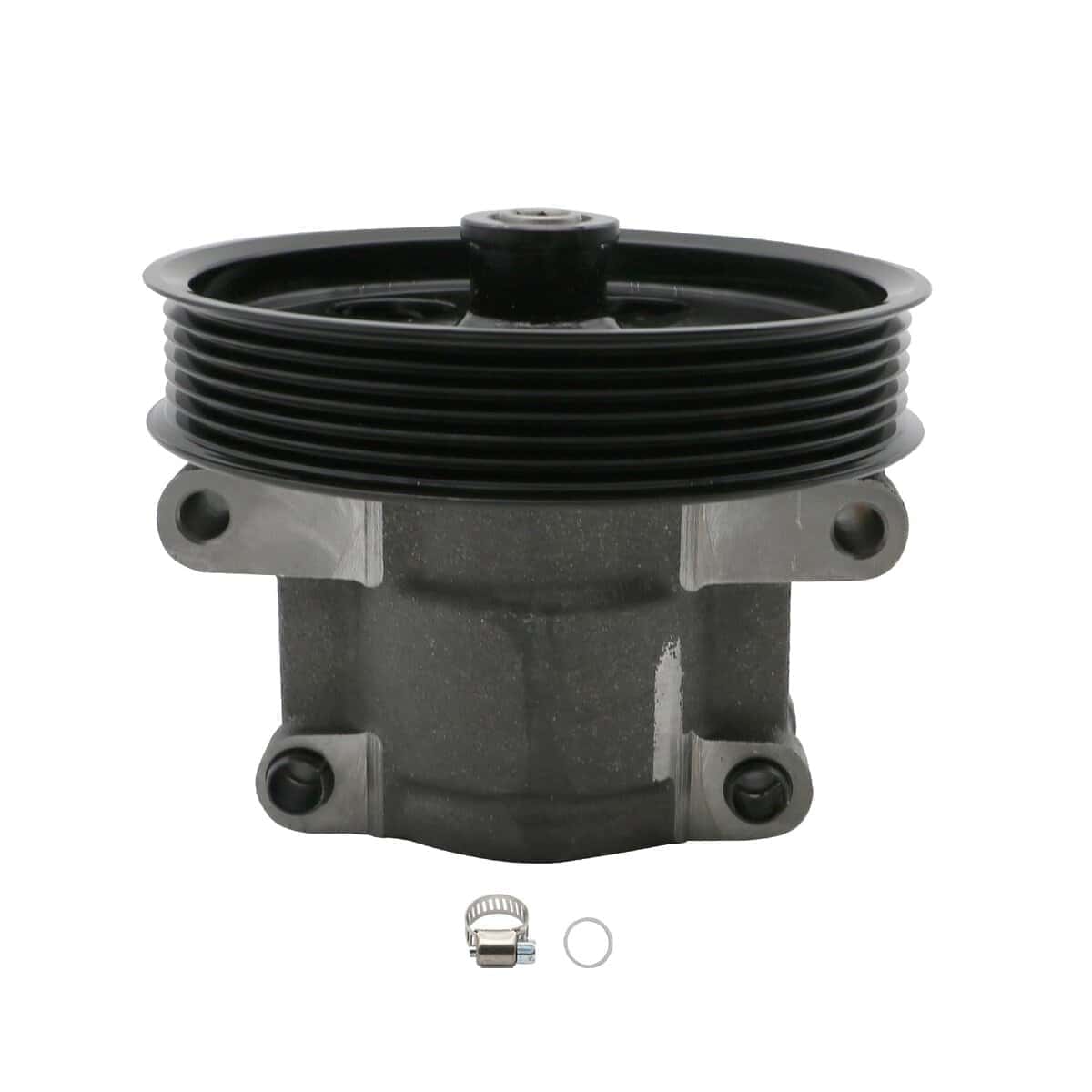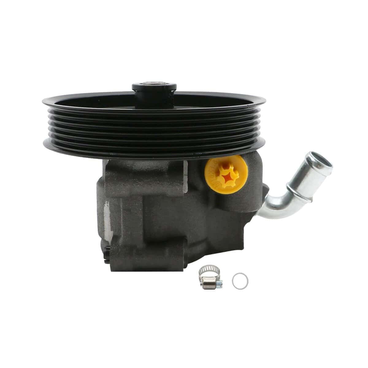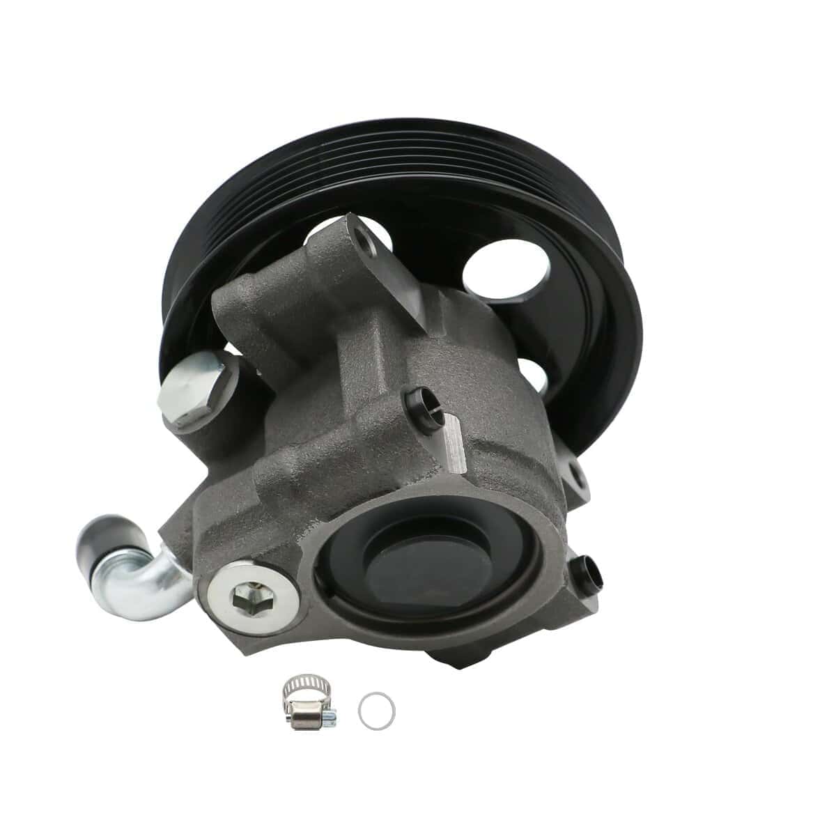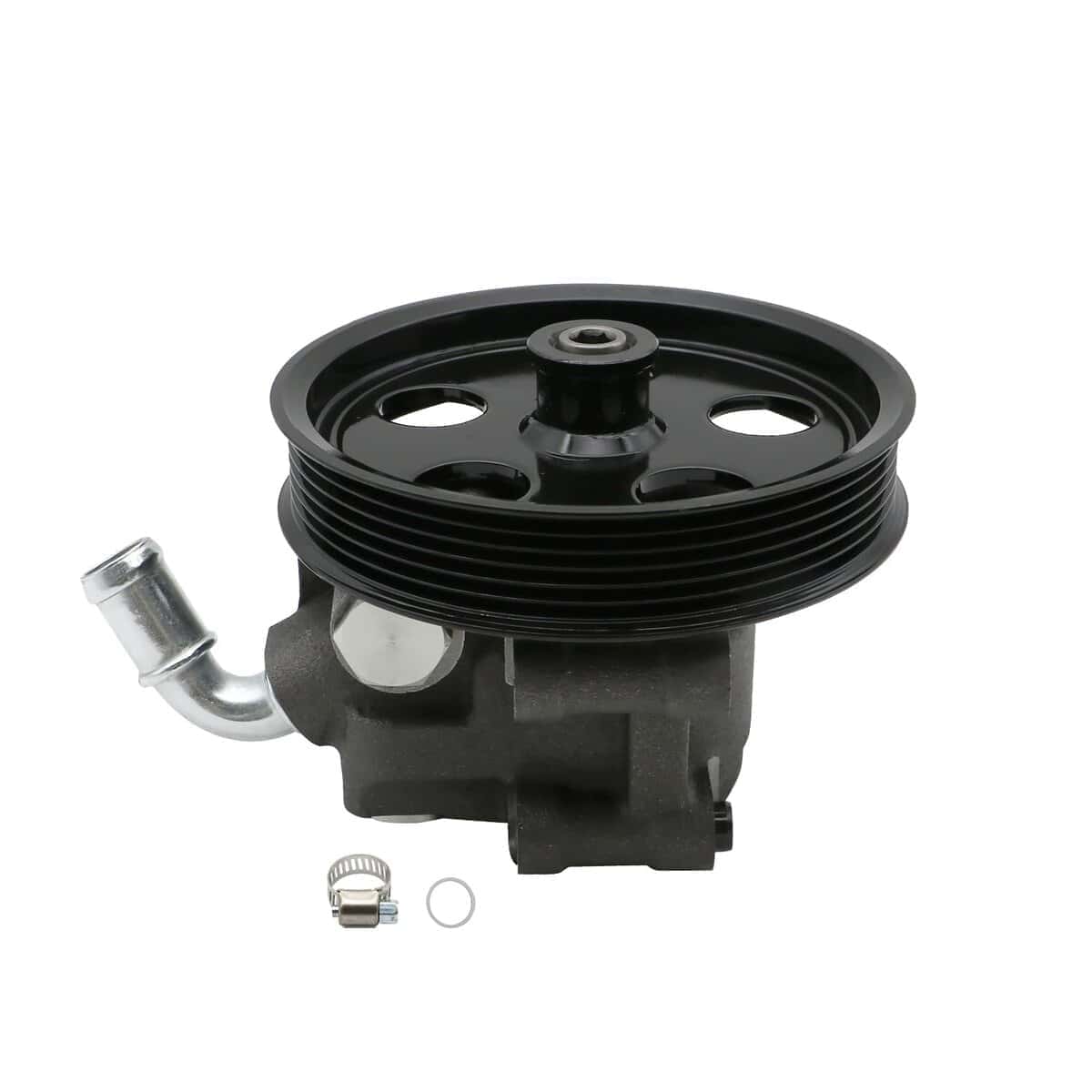 5. Paquete: ensamblaje de bomba de dirección asistida 20-314 con polea, O-ring extra y abrazadera empacados en una caja de color.