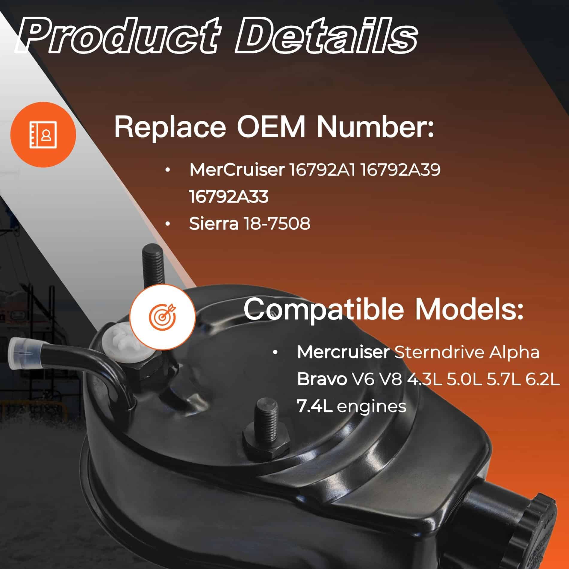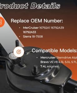 2. Esta bomba de dirección asistida está diseñada para ser un reemplazo versátil para varios modelos de MerCruiser Sterndrive, encajando perfectamente con los números de pieza de MerCruiser 16792A1, 16792A39, 16792A33, y con Sierra 18-7508.