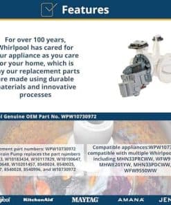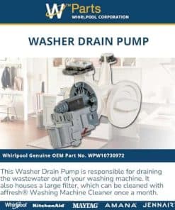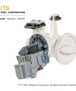 Bomba de drenaje para lavadora Whirlpool WPW10730972 en color blanco. Este es un repuesto genuino OEM para tu lavadora Whirlpool. Asegúrate de reemplazarla correctamente para mantener el buen funcionamiento de tu equipo.
