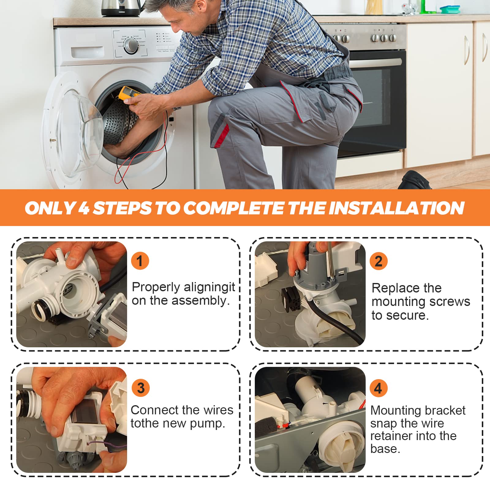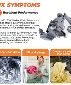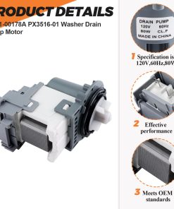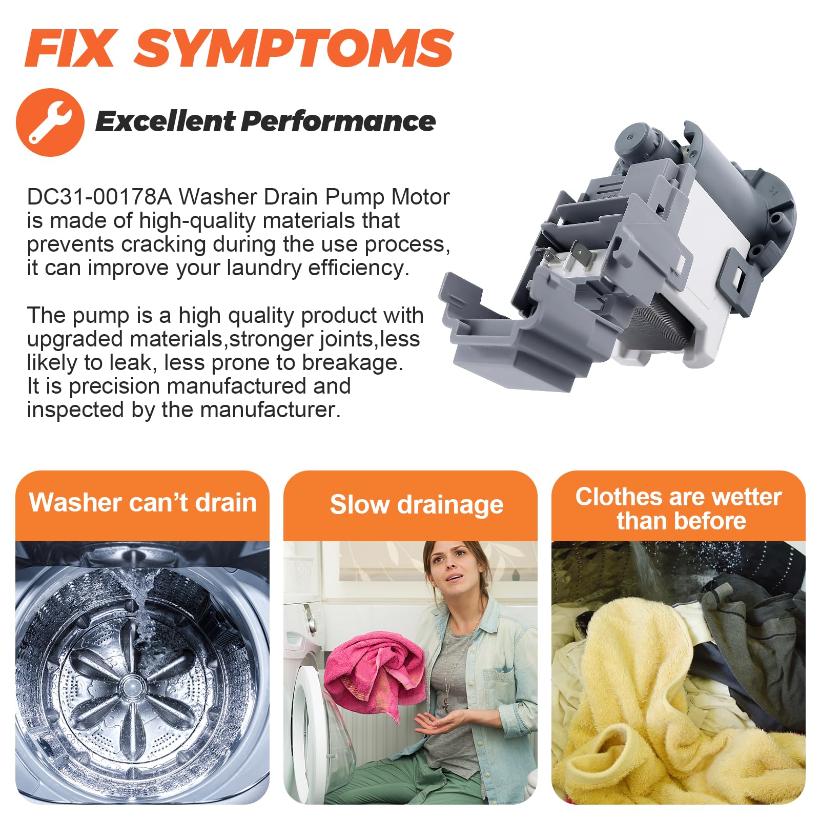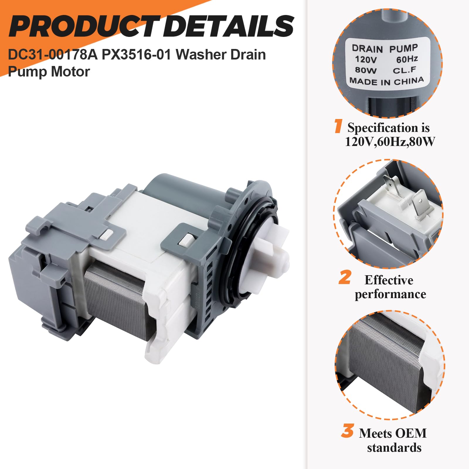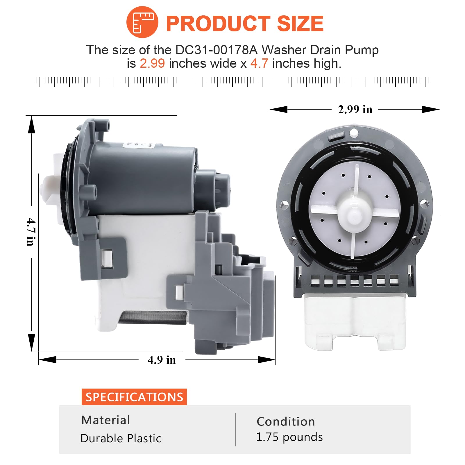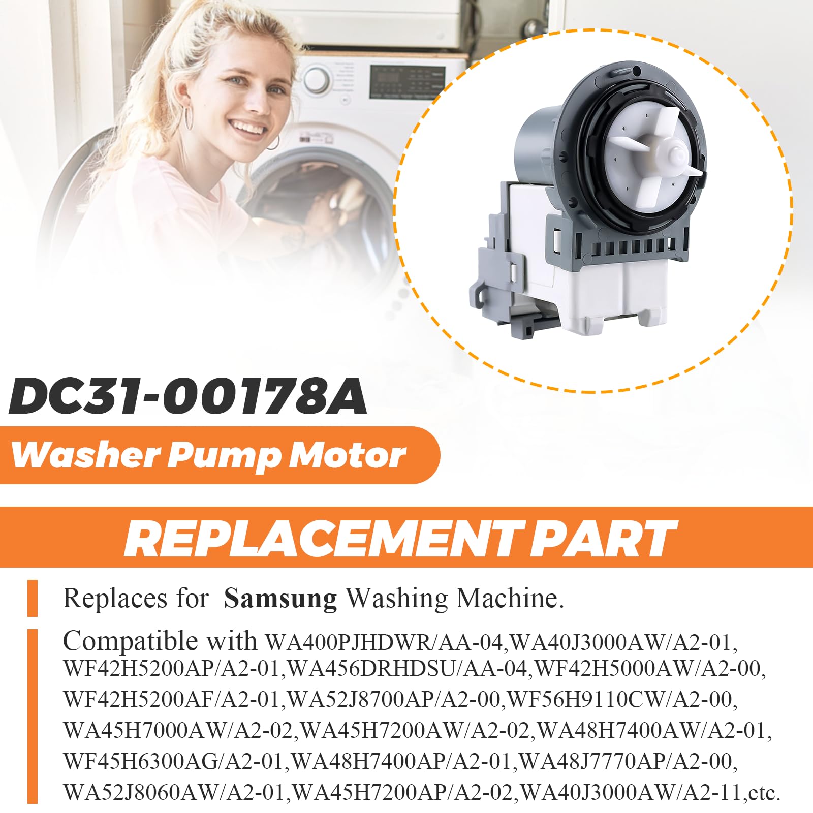 Esta bomba de drenaje (número de parte DC31-00178A) elimina el agua de la lavadora durante el ciclo de drenaje. Motor de bomba de drenaje de lavadora de 110v, 60Hz, 85w, 3600 rpm. Fácil de instalar con las herramientas necesarias incluidas. Soluciona problemas como ruidos, incapacidad de drenar, fugas y ropa más mojada de lo normal. Compatible con varios modelos Samsung. Nota: Antes de realizar la compra, asegúrese de consultar la compatibilidad con su modelo específico.