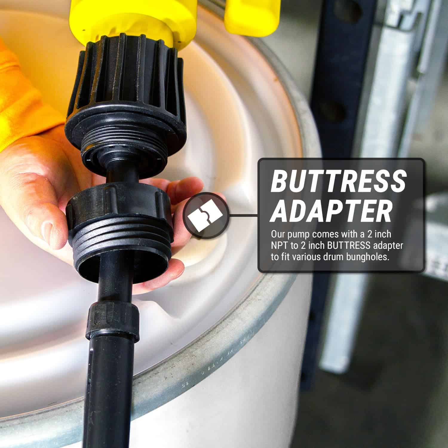 2. TOMA EXTENSIBLE – Ajustable de 22.6 pulgadas a 34 pulgadas para adaptarse a tambores de 15 galones hasta barriles de tambor de 55 galones con el adaptador de 2 pulgadas Buttress a 2 pulgadas NPT Bung.
