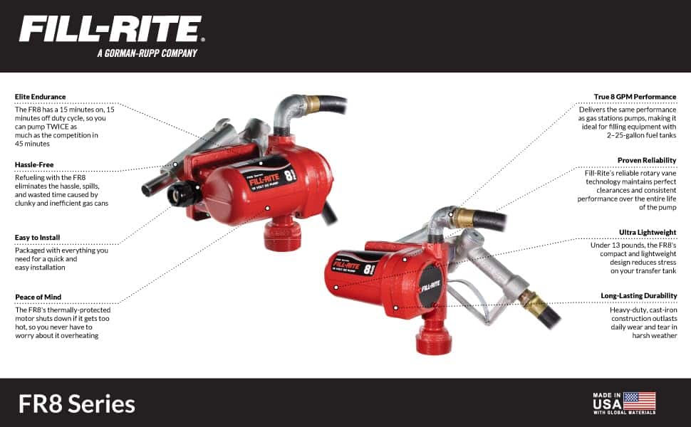Presentamos la Serie FR8, la forma más conveniente y eficiente de abastecer de combustible a su equipo pequeño. ¡Diga adiós a la molestia e ineficiencia de las latas de gasolina, las gasolineras y las bombas manuales para siempre! ¡Lleve su estación de repostaje personal a todas partes! El FR8 es la mejor opción para abastecer de combustible a equipos con tanques de combustible más pequeños. Es la solución perfecta para llenar más de 40 equipos diferentes como: cortadoras de césped, cargadores de dirección, miniexcavadoras, zanjadoras, tractores pequeños, trituradoras de tocones, cortadoras de malezas, esparcidores, máquinas de soldar, mezcladoras de mortero, martillos neumáticos, motos acuáticas personalizadas, motonieves, cuatrimotos y mucho más!