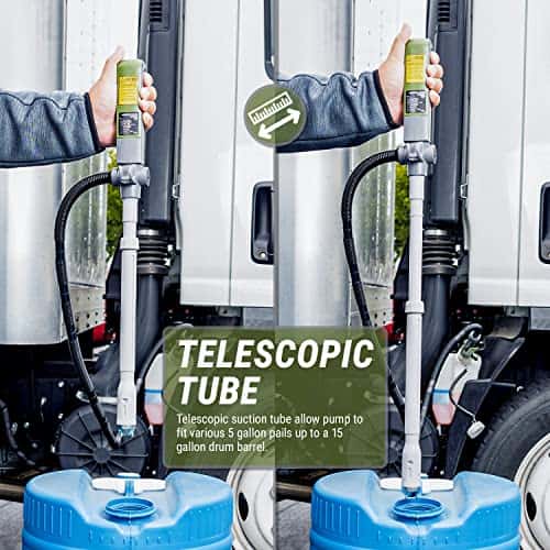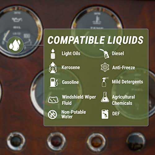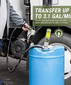 La Bomba de Transferencia TERA PUMP es adecuada para gasolina, diesel, DEF (AdBlue), E85, E15, agua no potable, queroseno, anticongelante, líquido limpiaparabrisas, detergentes suaves, productos químicos agrícolas y aceites ligeros. Cuenta con una manguera de descarga de 60 pulgadas (5 pies) para repostar a distancias más largas, un soporte de manguera de descarga integrado para un almacenamiento seguro y conveniente, un tubo de succión de gran tamaño de aproximadamente 15 a 20 pulgadas de longitud que se ajusta a latas de gasolina de 3 galones (~11.4 litros), latas de gasolina de 5 galones (~19 litros), hasta bidones de 20 galones, y un filtro de tubo de succión y cabezal de ducha que evita que los desechos no deseados entren en el tubo de succión. Alimentada con una batería recargable de iones de litio de 2900 mAh, la bomba TERA PUMP puede bombear aproximadamente 80 galones con una carga completa, con un tiempo de carga de 5 horas o menos. Viene con una garantía del fabricante de 1 año sobre defectos de fabricación.