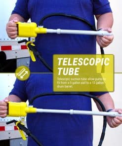 TRANFERENCIA EFICIENTE DE COMBUSTIBLE: La bomba de transferencia de combustible TERA PUMP TRCDM es ideal para una variedad de líquidos, incluyendo gasolina, diesel, DEF (AdBlue), agua, kerosene, anticongelante, lavaparabrisas, detergentes suaves y productos químicos agrícolas. Con un tubo de succión ajustable de 15 a 20.5 pulgadas y un diámetro de 1.25 pulgadas, se adapta a la mayoría de los contenedores de combustible, como latas de gas, bidones y tambores.