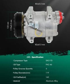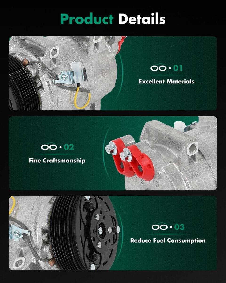 Con la fuerte presión comprimida producida por este compresor de A/C, el sistema de aire acondicionado puede proporcionar rápidamente aire frío para que te sientas relajado y cómodo durante el viaje. Notas: El artículo viene con aceite cuando se envía, por lo que no es necesario añadir aceite la primera vez que lo uses. Sin embargo, debes añadir el refrigerante, por favor añádelo al 70-80%, no es necesario llenar totalmente. Nuestro kit de compresor de A/C funciona eficientemente con poco ruido y vibración mínima para proporcionarte un viaje súper fresco. Conducir a una velocidad estable ayudará a reducir el consumo de combustible. El compresor SCITOO está principalmente hecho de aleación de aluminio de alta resistencia que garantiza un rendimiento confiable y una larga vida útil.