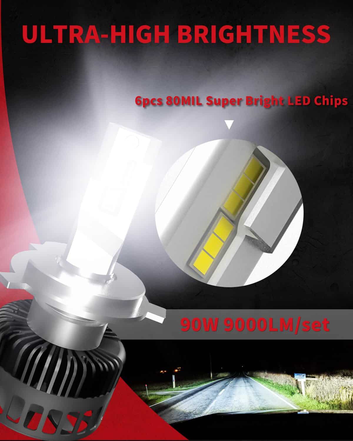1. Excelente Salida de Luz Brillante y Conducción Segura: No te pondrás en riesgo al conducir de noche con estas bombillas led 9003 H4. 600% más brillante que los halógenos tenues y maximiza eficientemente la salida de luz con un menor consumo de energía que otros. La bombilla te ayuda a ver más lejos y amplio en una distancia lejana y proporciona una mejor visibilidad con una potente luz blanca continua y brillante en la carretera oscura.