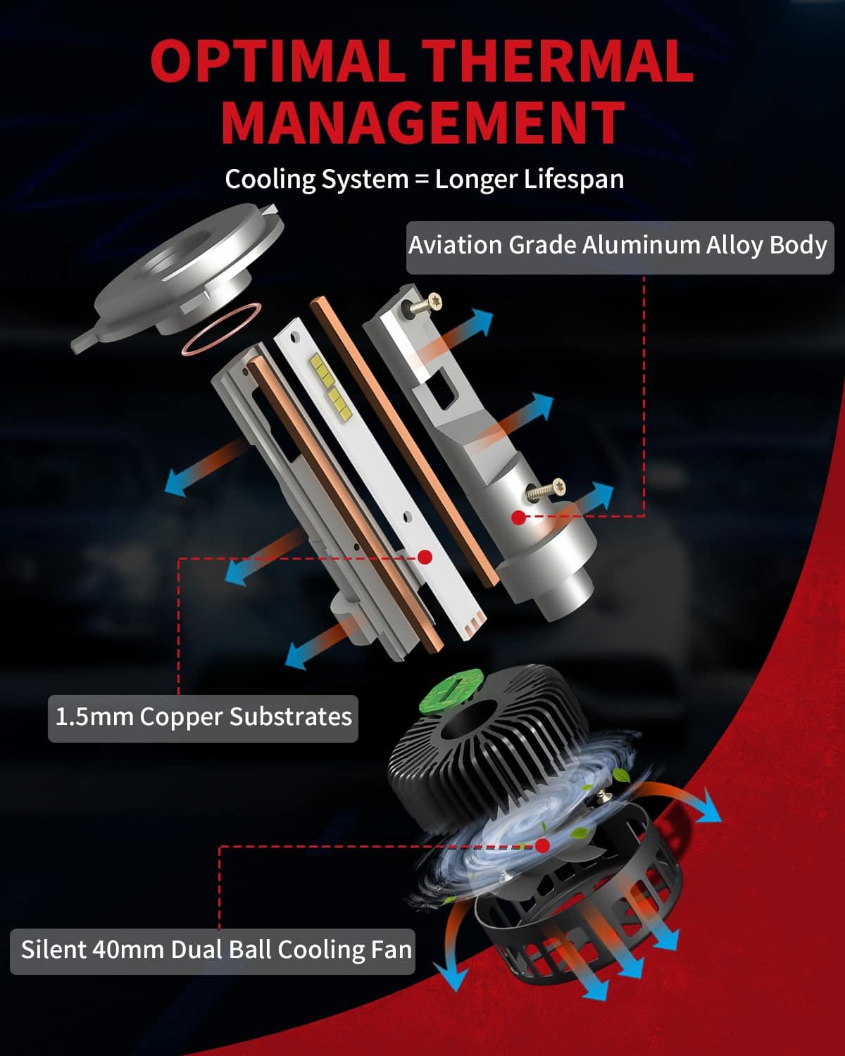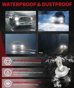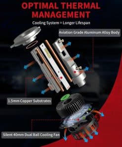 4. Sistema de Enfriamiento Doble Más Fuerte: Dura Más Tiempo El eficiente sistema de enfriamiento, diseño de ventilador de refrigeración de doble bola de 40MM junto con el sistema de disipación de calor de 42MM, asegura una capacidad de enfriamiento súper efectiva y una disipación de calor altamente eficiente incluso en una conducción prolongada. Mantén las bombillas funcionando por más tiempo y rara vez sobrecalientan o se vuelven tenues. Más estable que otras bombillas La vida útil es mucho más de 30000 horas.
