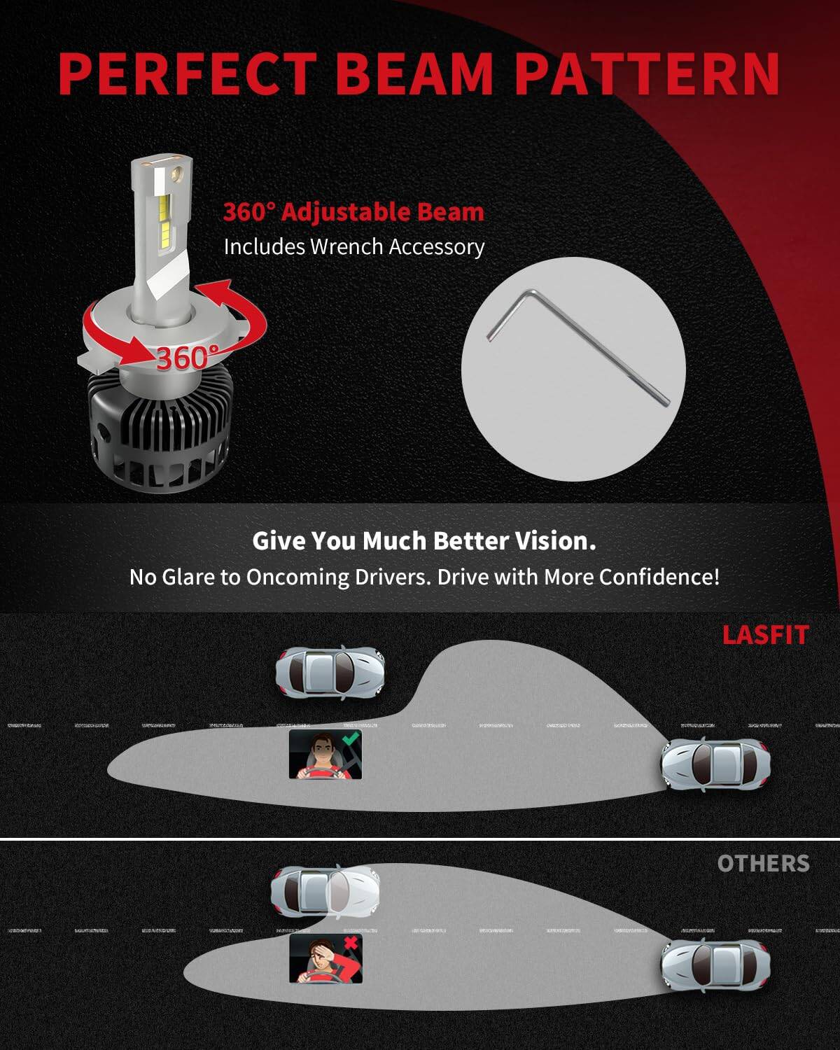 2. Patrón Ajustable a 360: Es suavemente adecuado para diferentes carcasa con diferentes ángulos y el patrón de luz podría ajustarse fácilmente. El patrón de luz se establece correctamento por defecto pero es libre de ajustarse aflojando el tornillo usando la llave en el empaque. Puedes ajustar hasta obtener el patrón de luz deseado. Sin deslumbrar a los vehículos que se aproximan. Sin puntos oscuros y el patrón está enfocado casi a la perfección.